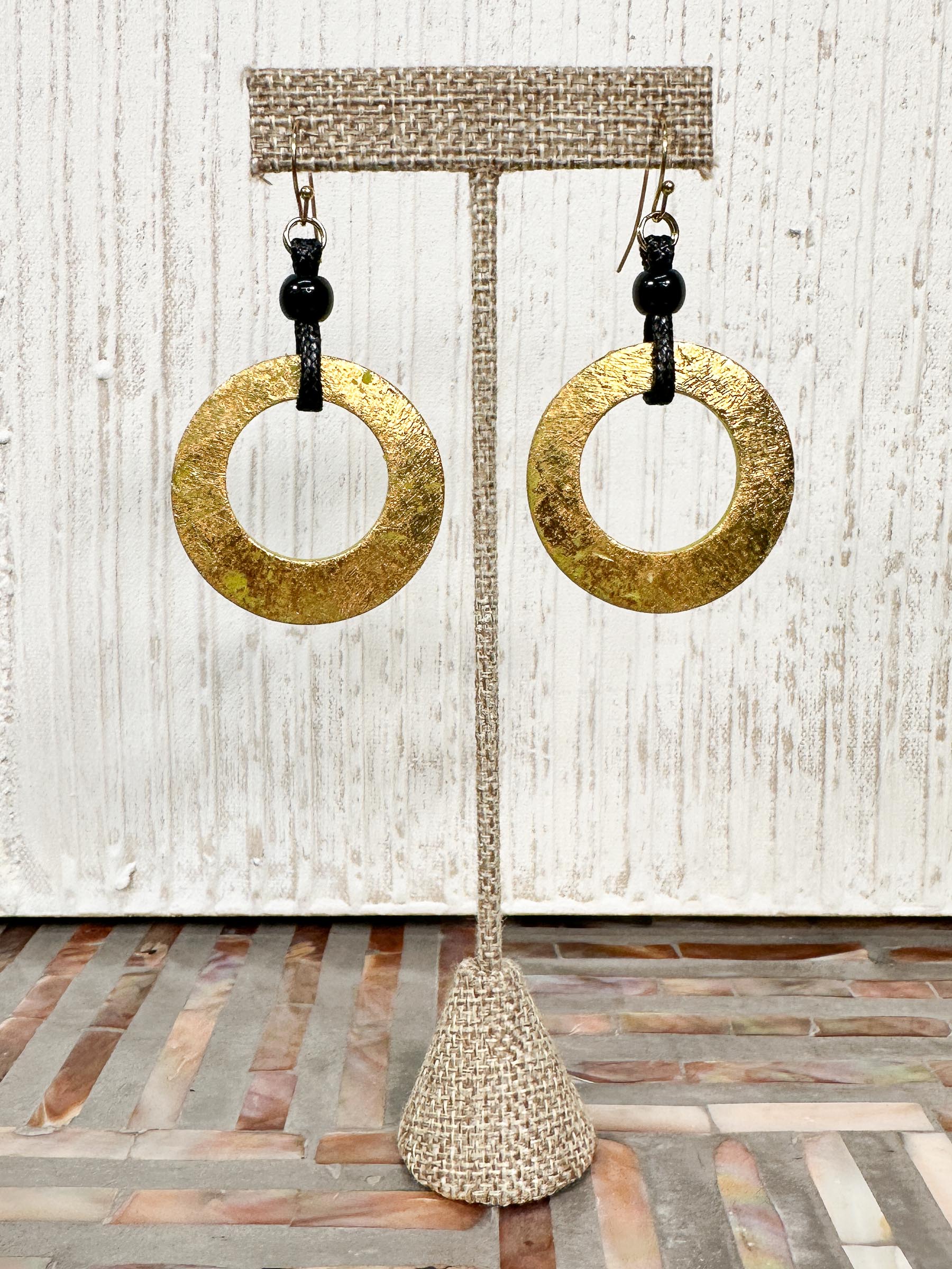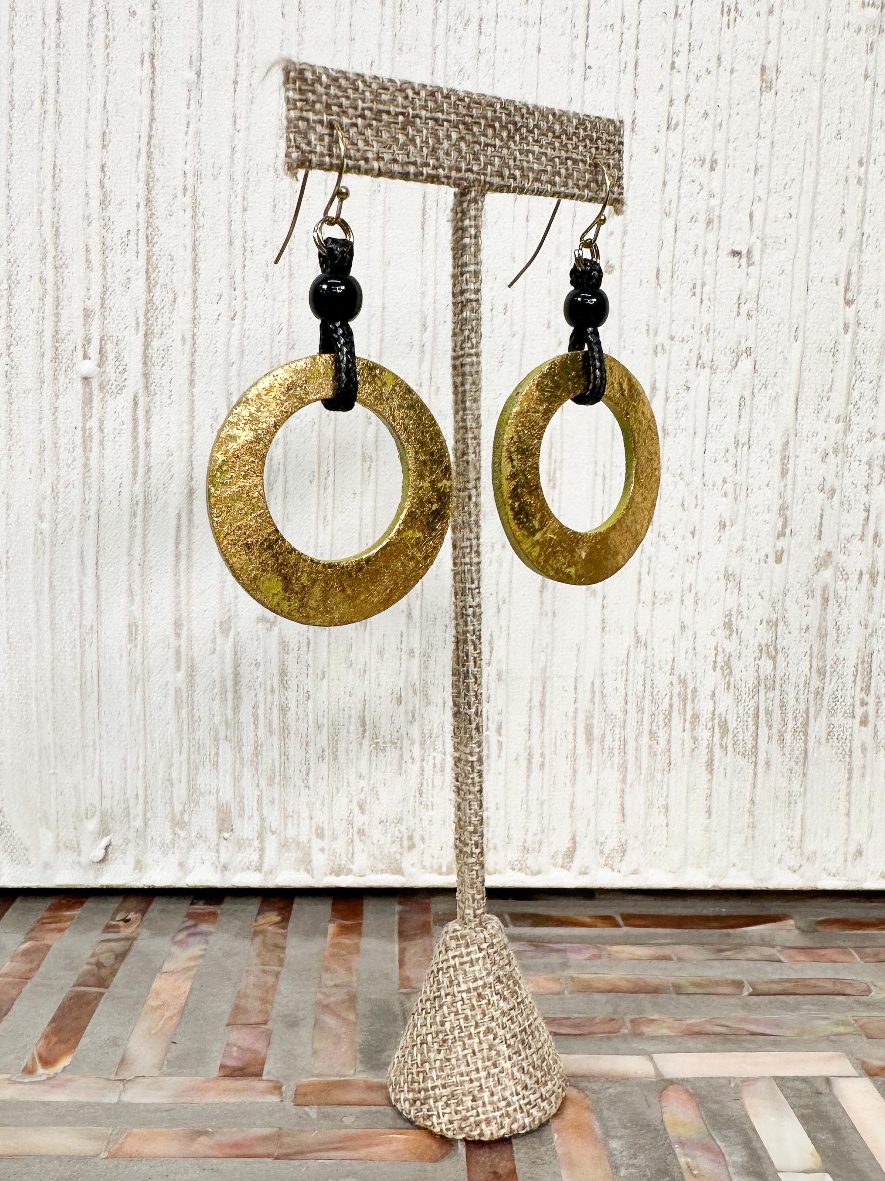 The Alisha D Round Drop Earrings offer an artful take on everyday ease, featuring lightweight open papier-mâché rounds in an earthy olive tone finished with a soft golden gilt overlay for subtle shimmer. Each round drops from black woven cord, accented with a single coordinating bead that adds gentle movement and contrast, and is finished with fish hook ear wires for comfortable wear. Effortless yet distinctive, these earrings bring a touch of organic texture and understated drama to both casual and elevated looks.