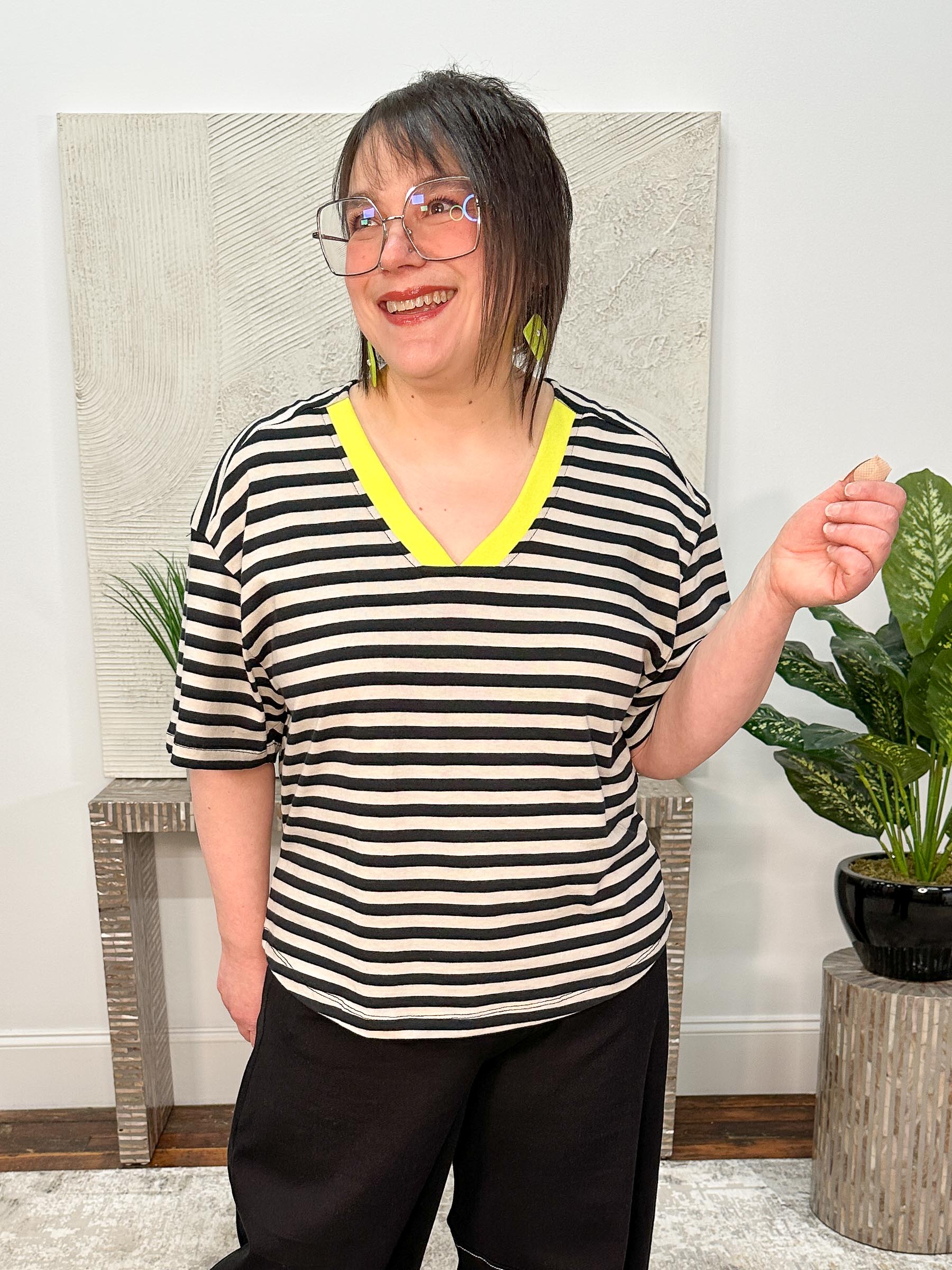 he Urban V-Neck Tee in Electric from Alembika delivers everyday ease with a bold twist. Crafted in a soft striped jersey knit of taupe cream and black, this effortless tee is energized by a flash of bright electric neon green at the V neckline. The relaxed yet controlled boxy silhouette gently skims the body without feeling oversized, while uniquely shaped shoulders flow into short dropped sleeves for a modern, architectural touch. Finished with a softly curved hemline, it’s an easy piece that pairs seamlessly with everything from coordinating Urban bottoms to your favorite denim.