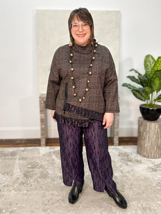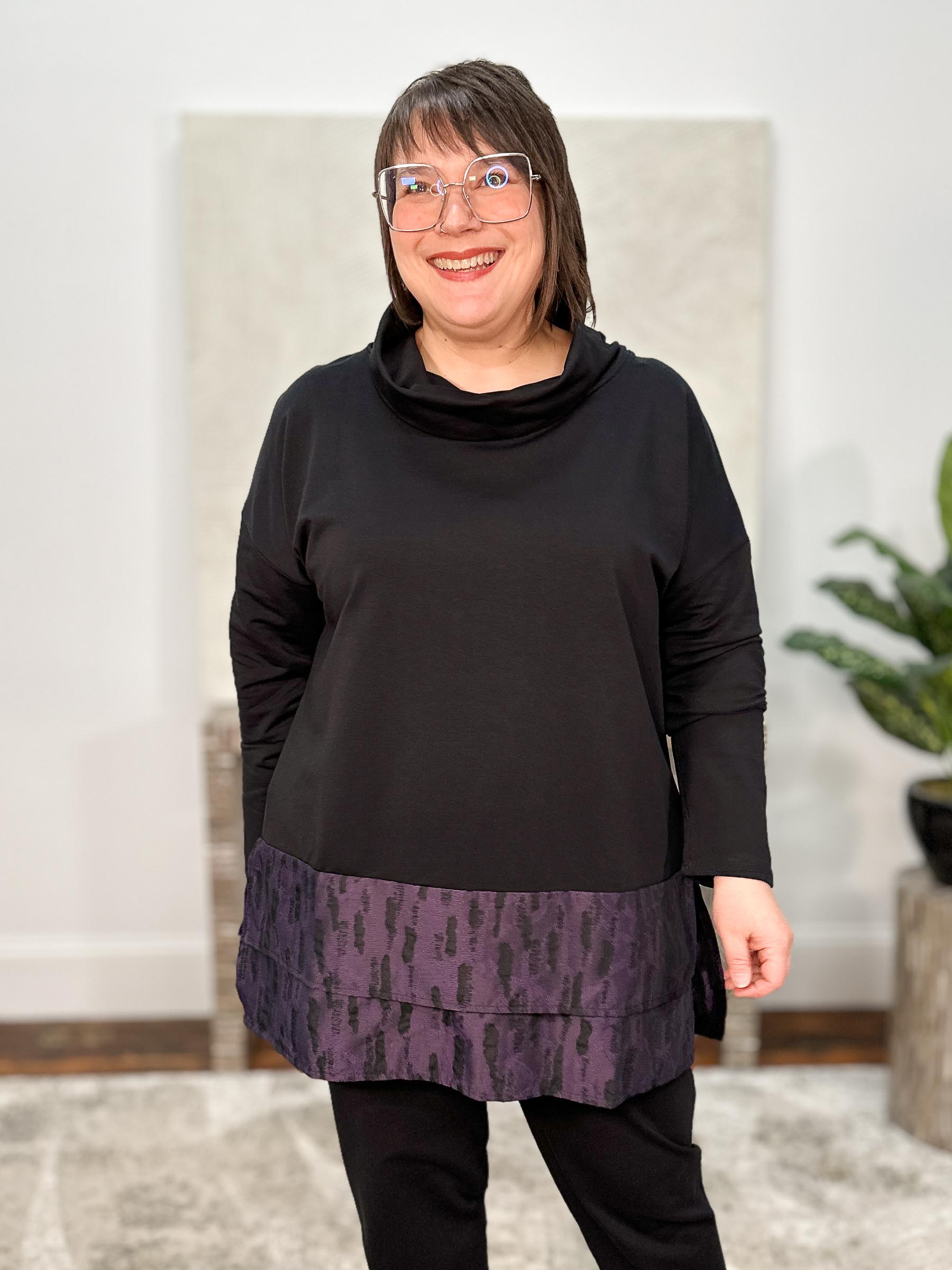 The Avi Tunic in Majesty is a chic, modern silhouette crafted in a soft French terry knit for cozy comfort with elevated style. The straight, boxy shape features a fold-over turtleneck and long dropped sleeves, creating an effortless drape. Finished with an even hemline trimmed in a double panel of purple taffeta, it adds a subtle pop of texture and color contrast for an artful finish.