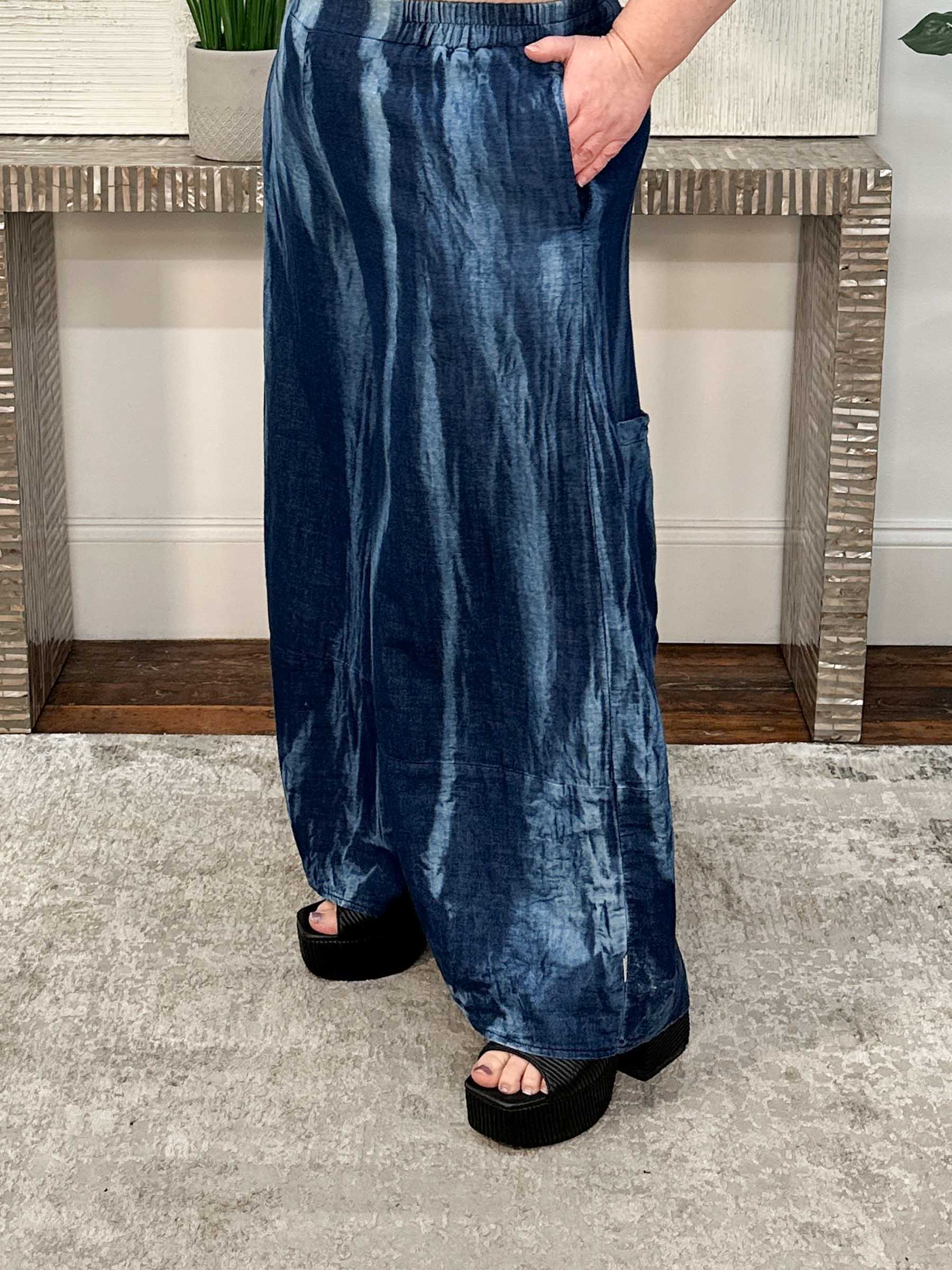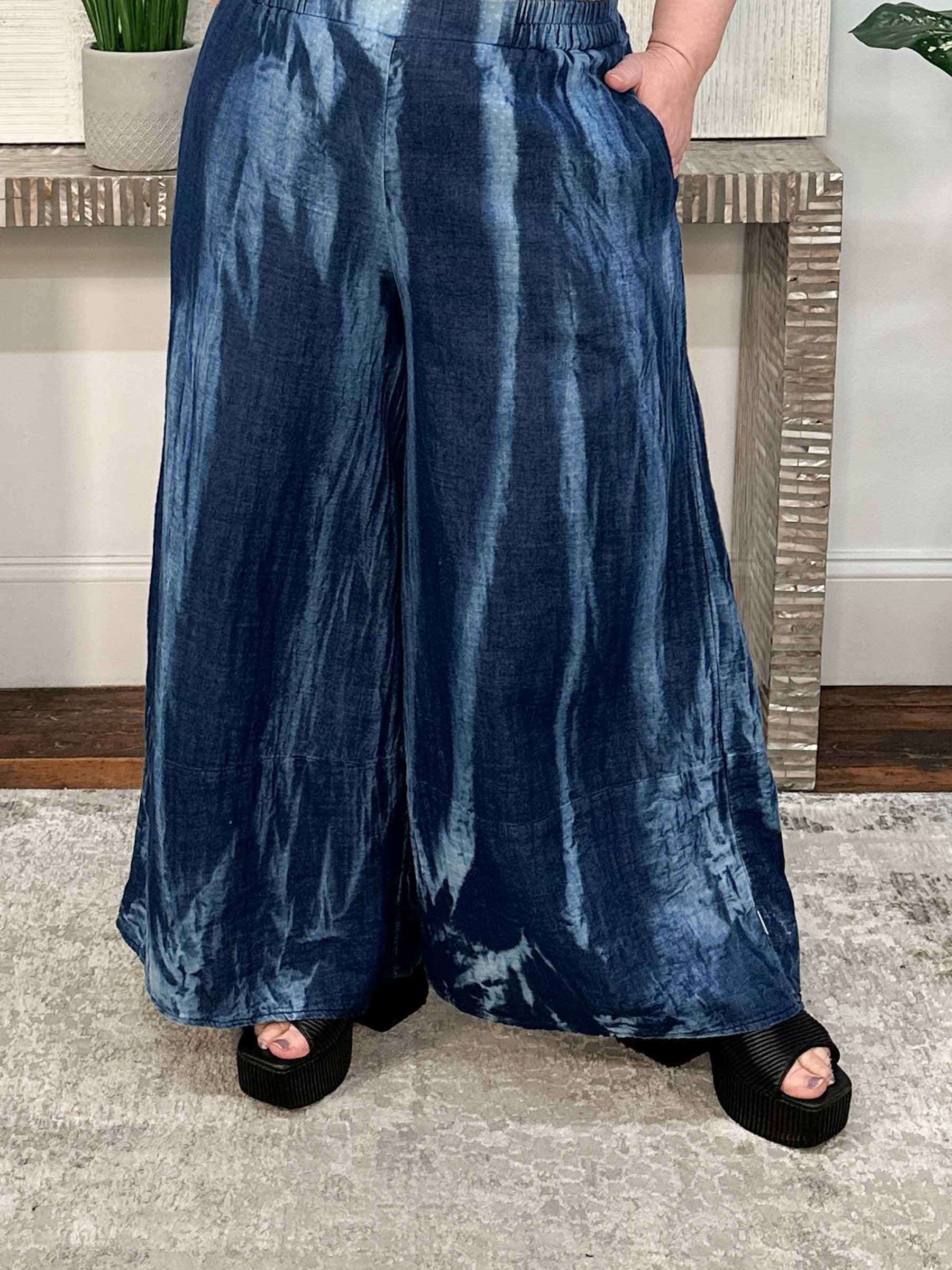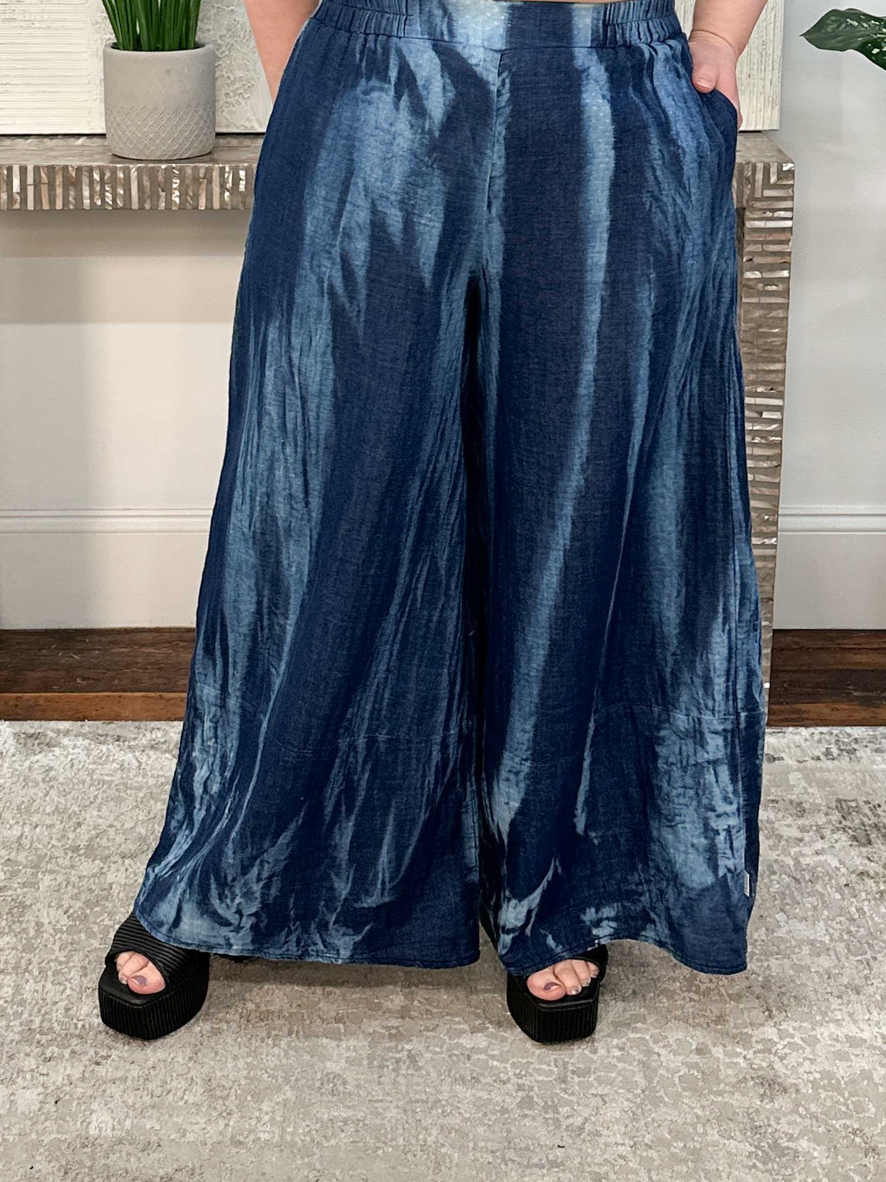 The Aura Wide Leg Pant by Luukaa is an effortless essential in the dreamy Candy Sky cloud-dye fabric, offering a soft, gauzy texture with a subtle denim-like feel in layered shades of blue. Designed with a flowy wide leg silhouette, this pull-on style features an elasticized waistband for all-day comfort and side seam pockets for everyday ease. Large patch pockets at the back of the legs add visual interest and a touch of artful detail, balancing relaxed wearability with modern design. An easy, elevated pant that pairs beautifully with coordinating tops or simple knits for endless styling possibilities.