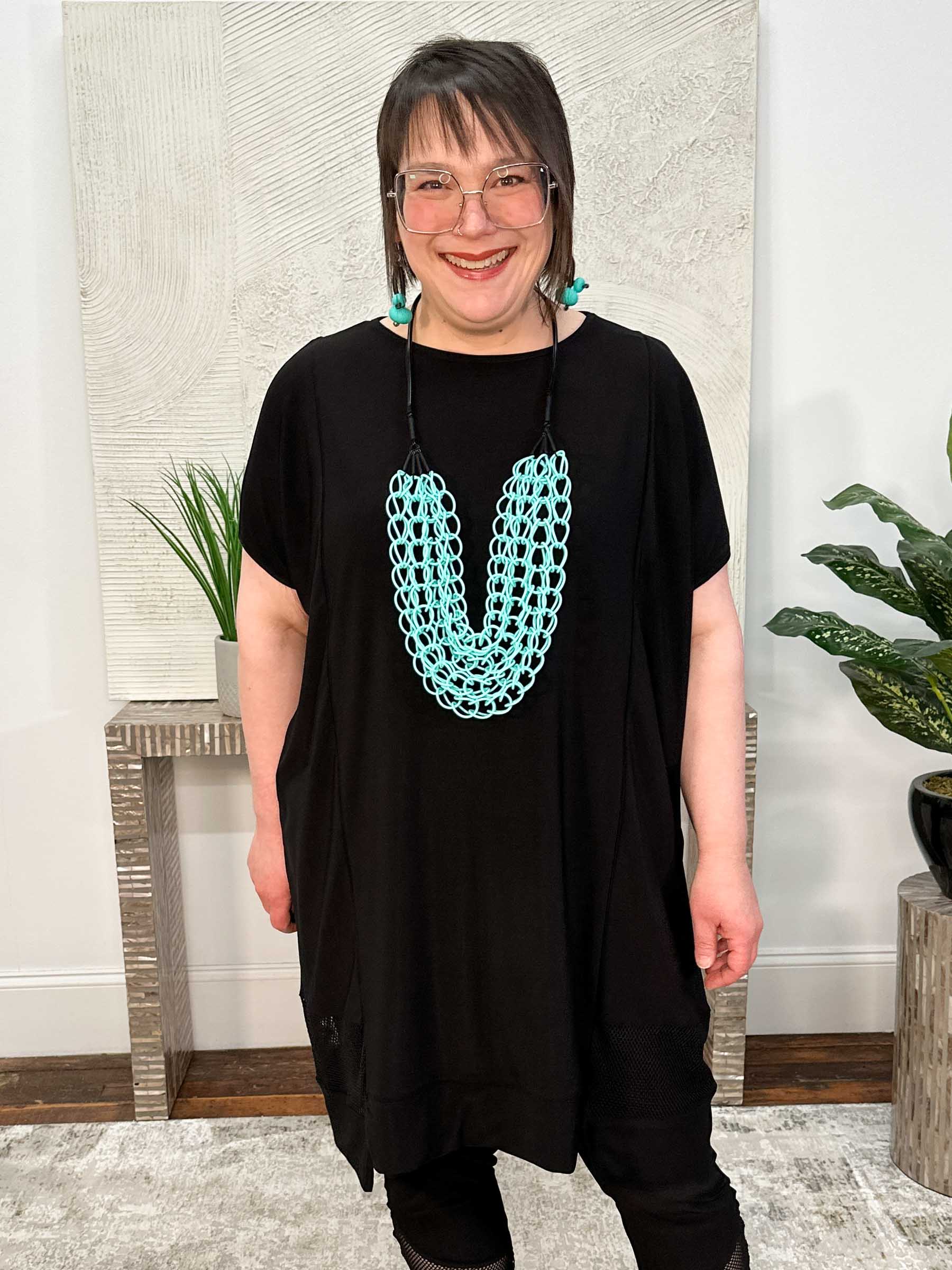 The Diagoras Dress in Network brings modern edge to an easy, architectural silhouette. This oversized tunic dress features a generous boxy fit, round neckline, and cap-sleeve arm openings for a clean, minimalist look. A slightly stepped hemline is accented with net mesh inserts at the sides, adding texture, contrast, and subtle movement. Crafted in Kozan’s Truli fabric, a heavier-weight stretch jersey knit with a smooth, structured drape, this piece offers body without bulk and holds its shape beautifully throughout the day. We love it styled with the coordinating legging for a confident, modern look that feels intentional and effortlessly put together.