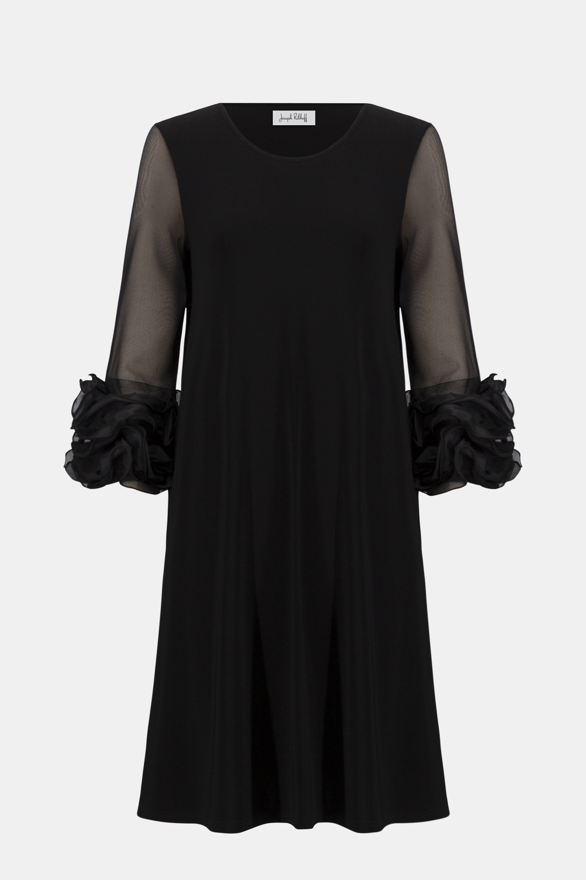 Silky Knit and Mesh A-Line Dress With Ruffled Trim, Black