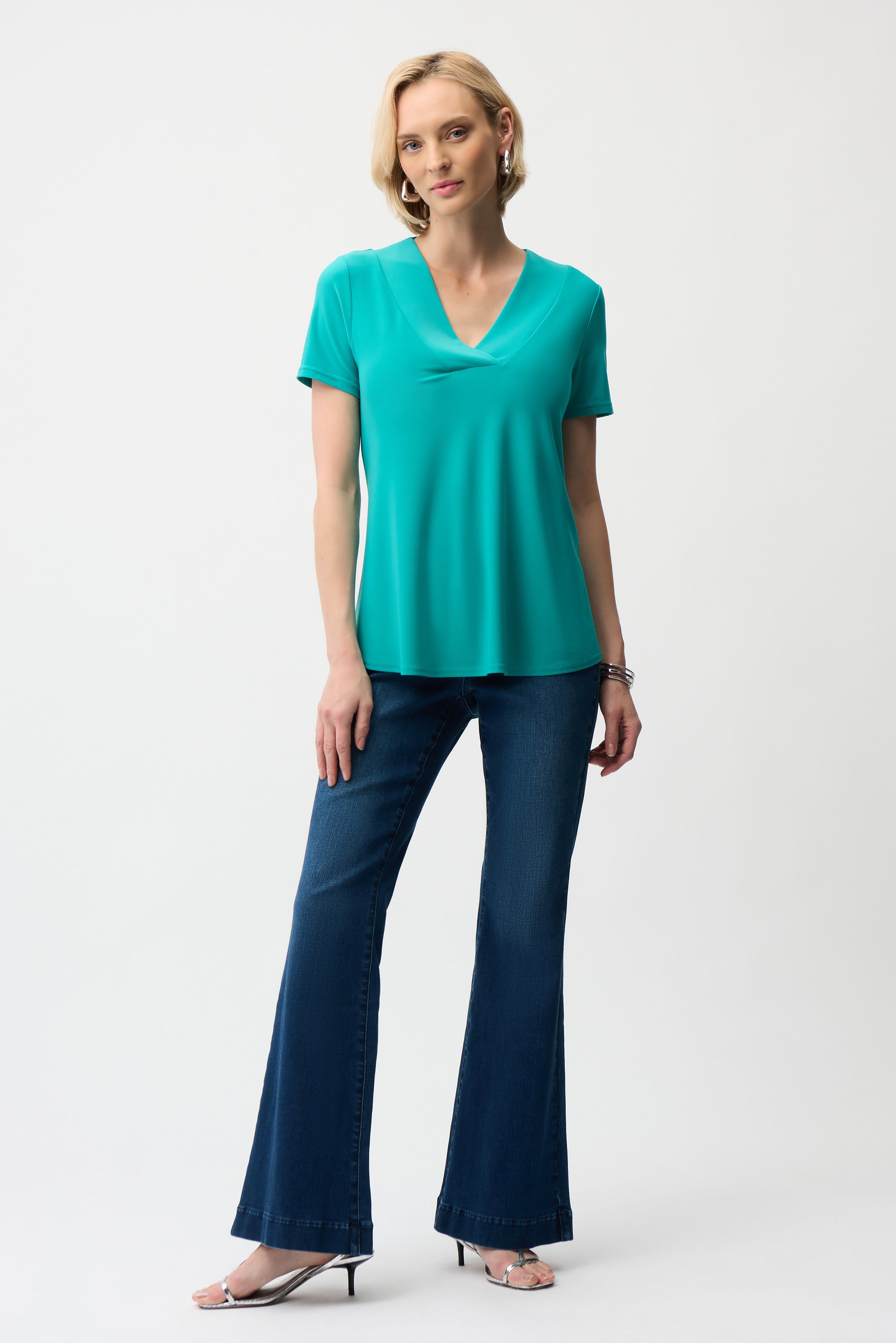 The Silky Knit V-Neck Flared Top seamlessly blends refined polish with effortless wearability, making it a key piece for creating a flawless, pull-together look. Crafted in a smooth, silky stretch knit, this elegant style features a chic V-shaped neckline at both the front and back, adding a distinctive, modern touch. The flared sweep through the body brings soft movement and subtle drama, lending undeniable poise and glamour with every step—perfect for elevating everything from tailored pants to sleek skirts or denim.