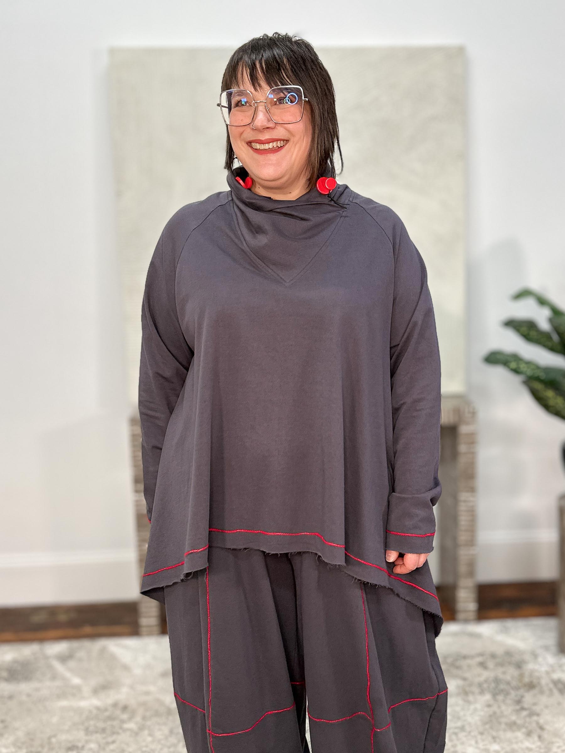 The Cafe Shirt, Grey is a distinctive style in soft French terry knit with red stitch accents, designed with a full flared silhouette that moves with ease. It features raglan long sleeves and a curved hemline that dips to points at the sides, with contrast stitch detailing at the unfinished edges of both body and sleeves. A cross-over cowled V-neckline completes the look, bringing an artful Kedem Sasson touch.