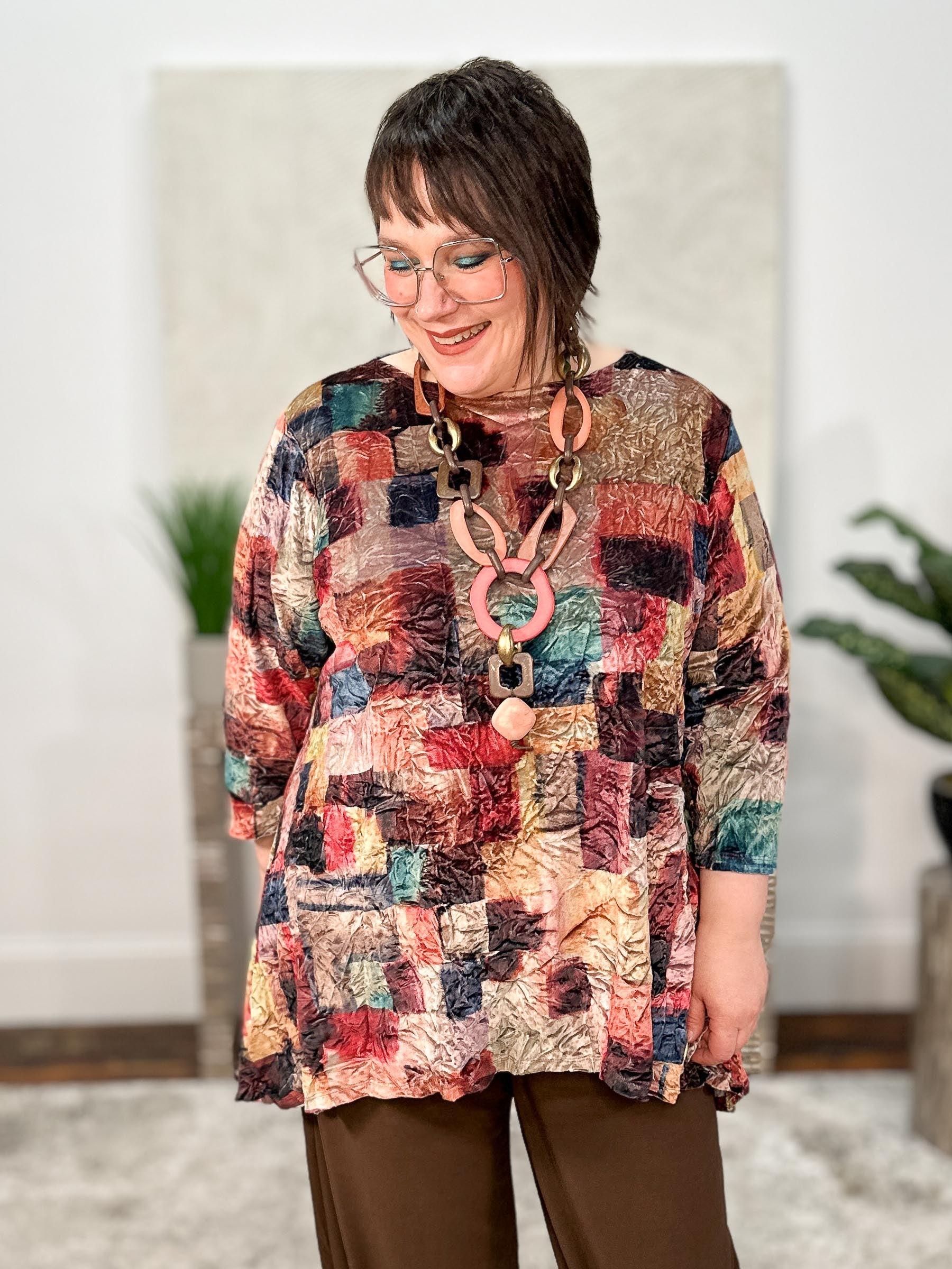 The Dima Tunic brings an elevated touch to Kozan’s signature easy-chic silhouette. Crafted in crushed velvet featuring the Notre Dame print — an artful blend of browns, peaches, teals, and multi-color tones — this style offers rich texture and painterly depth.