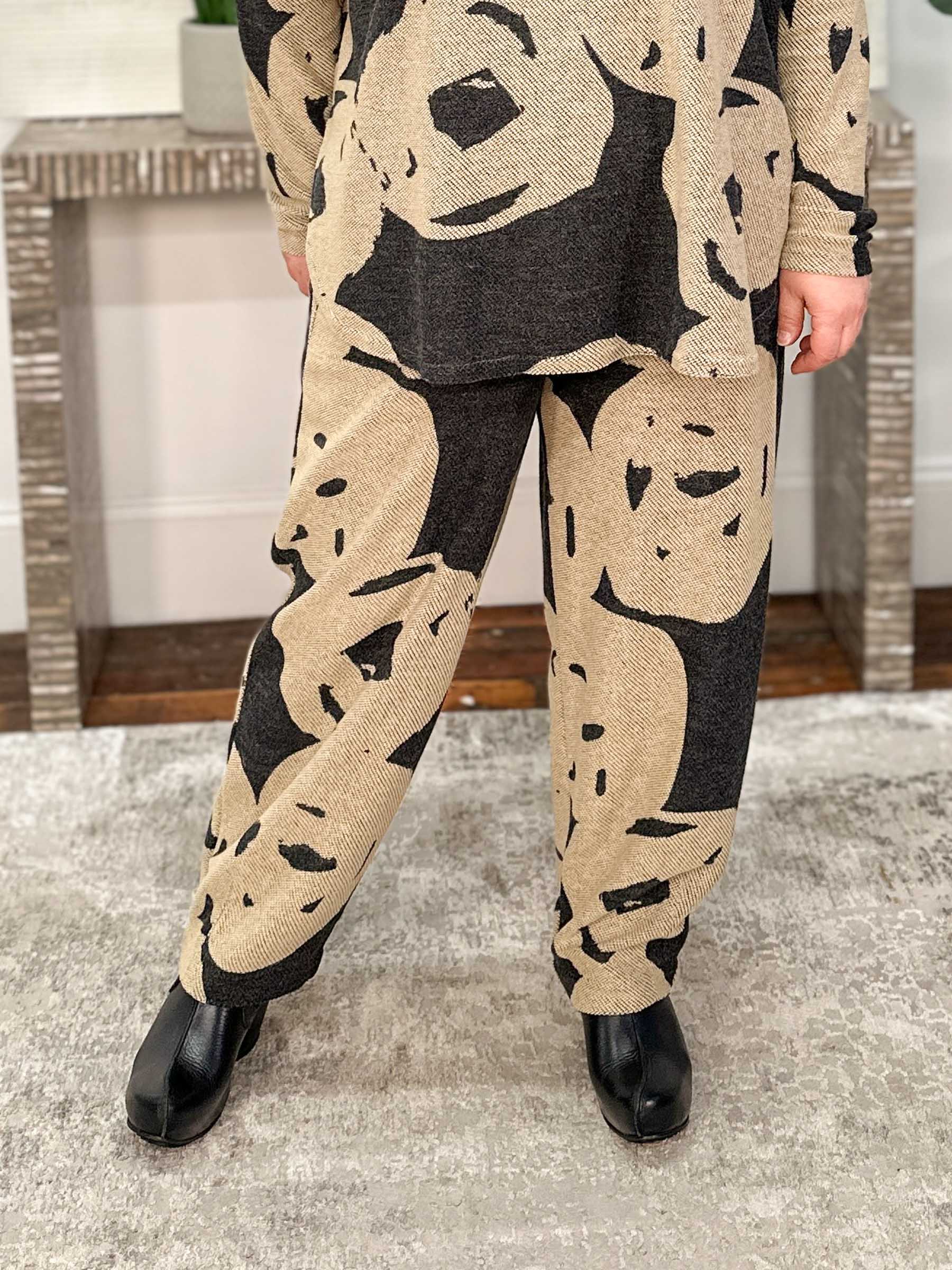 The Barrel Lantern Pant makes a statement in a bold brushstroke dot print of grey and beige, crafted in a cozy knit fabric that adds beautiful texture. Designed with curved barrel-shaped legs and subtle darts at the hemline for soft shaping, this style blends artful structure with ease. A banded elasticized pull-on waistband and angled side pockets complete the look, offering comfort, versatility, and endless styling possibilities.