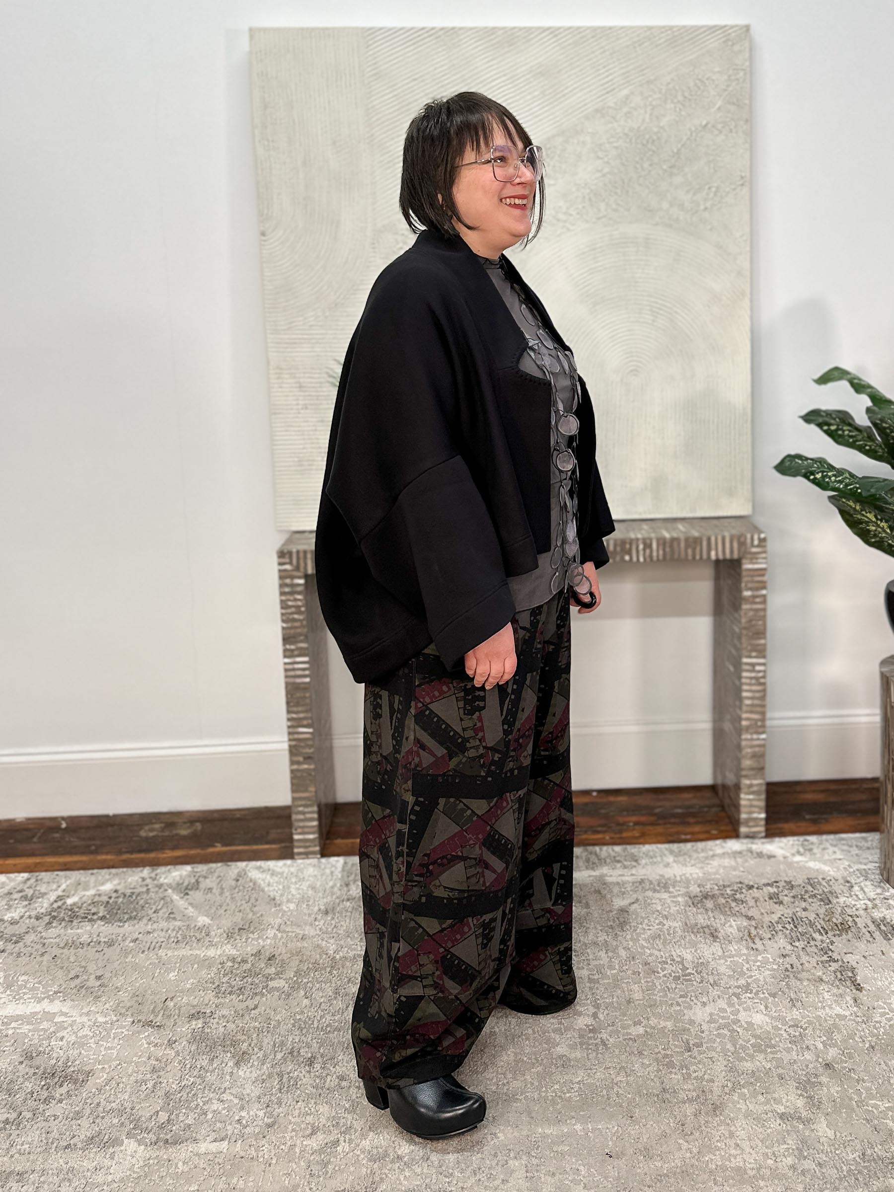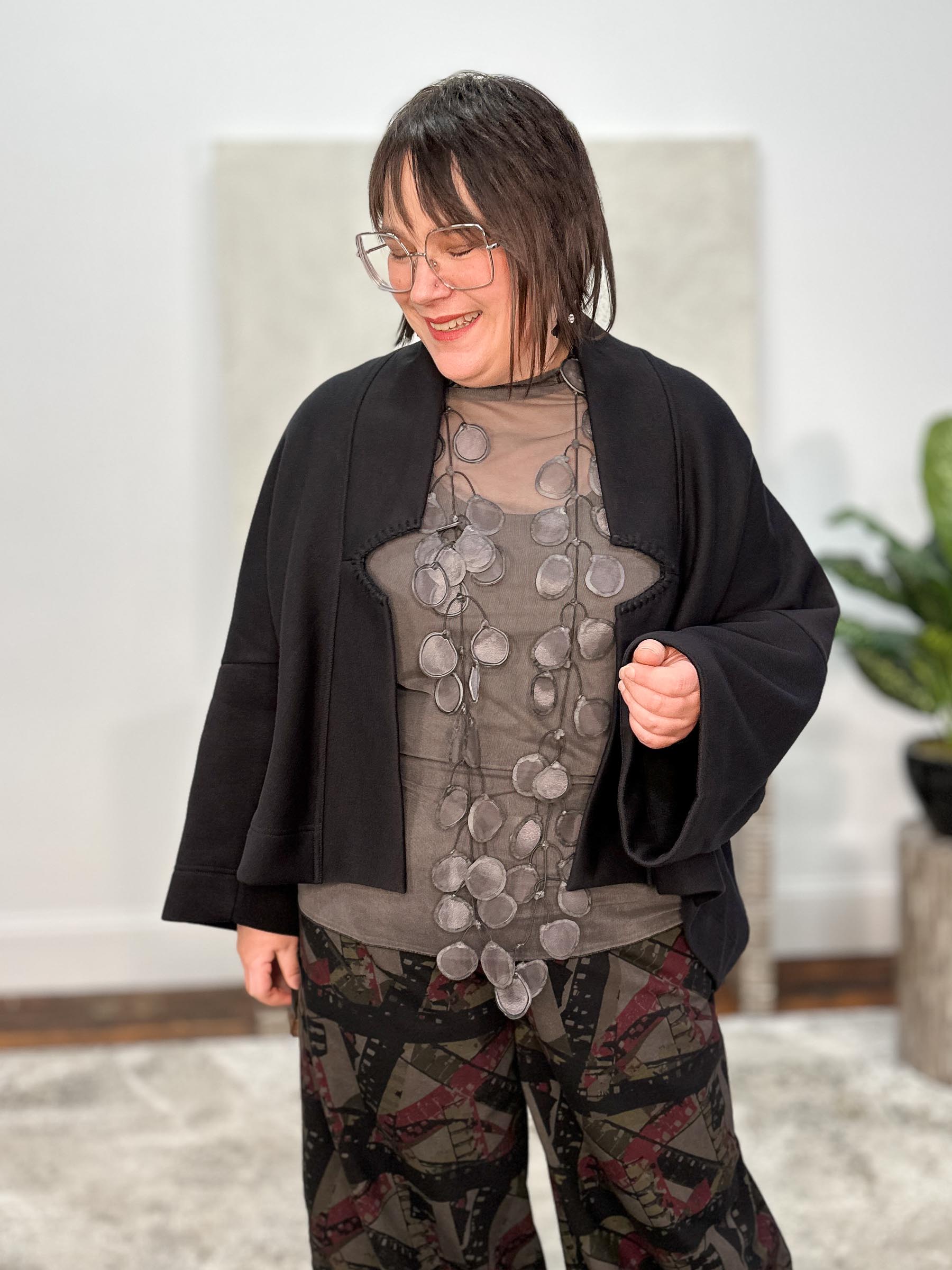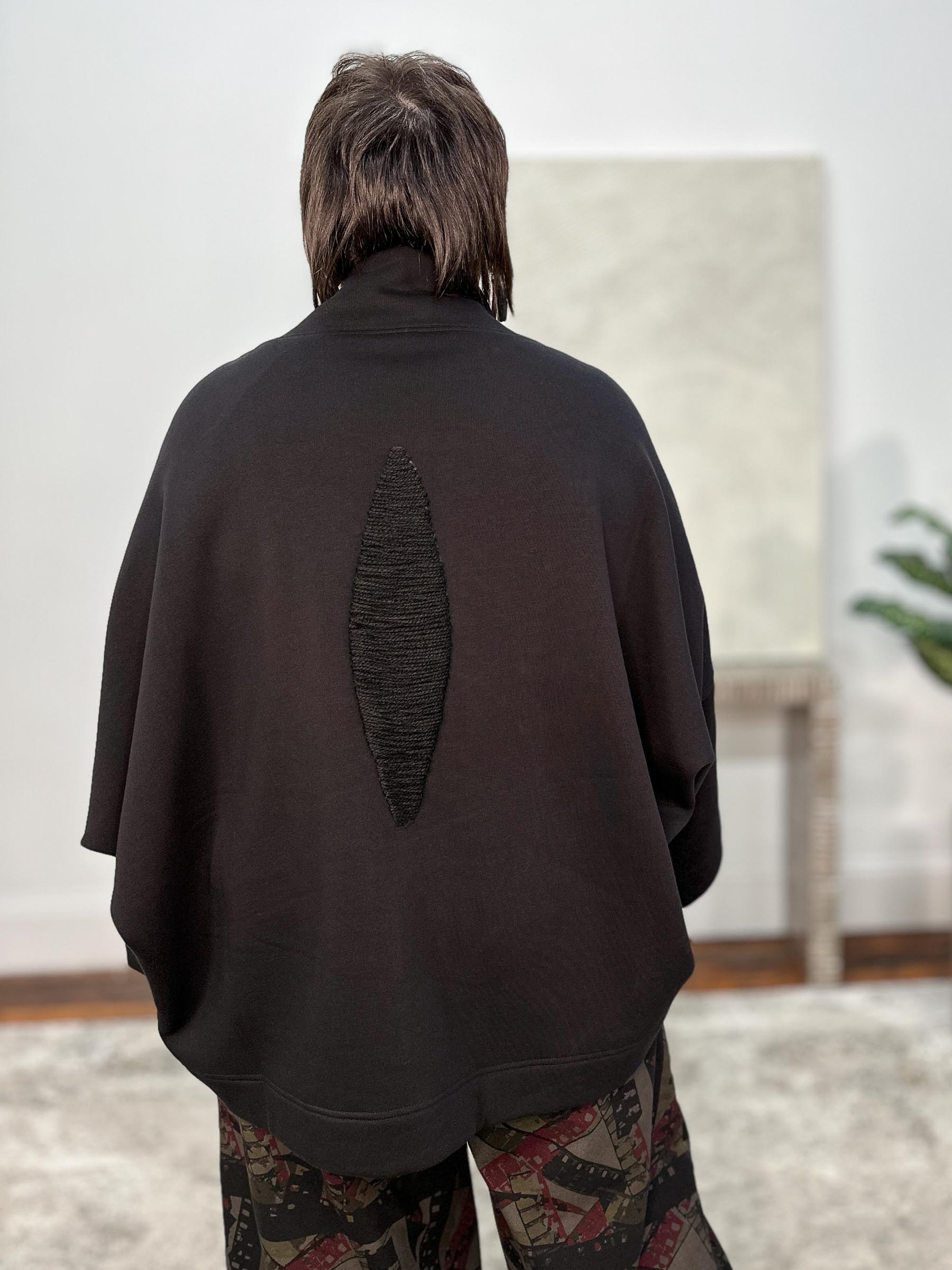 The Stratum Jacket is an artful layer in cozy fleece-backed sweatshirt knit, shaped into a cocoon kimono silhouette with a sculptural envelope-folded body. The front lapels feature a distinctive notch detail finished with whipstitching, a design element echoed by the diamond-shaped stitched embellishment at the center back. Effortlessly blending comfort with avant-garde edge, this jacket captures Kedem Sasson’s signature balance of form and artistry.