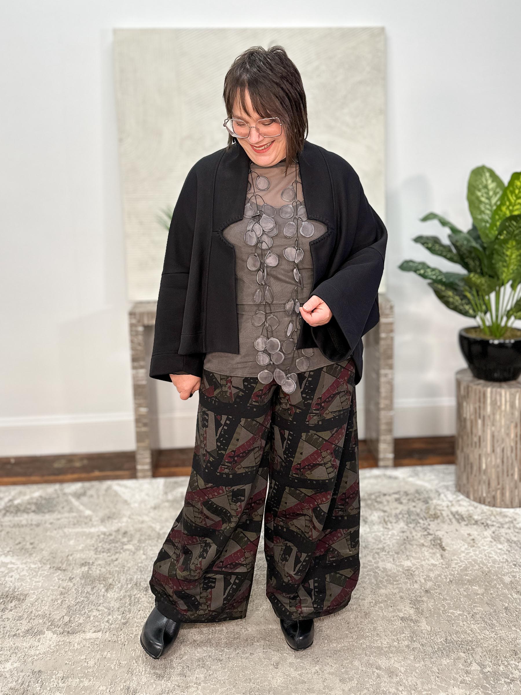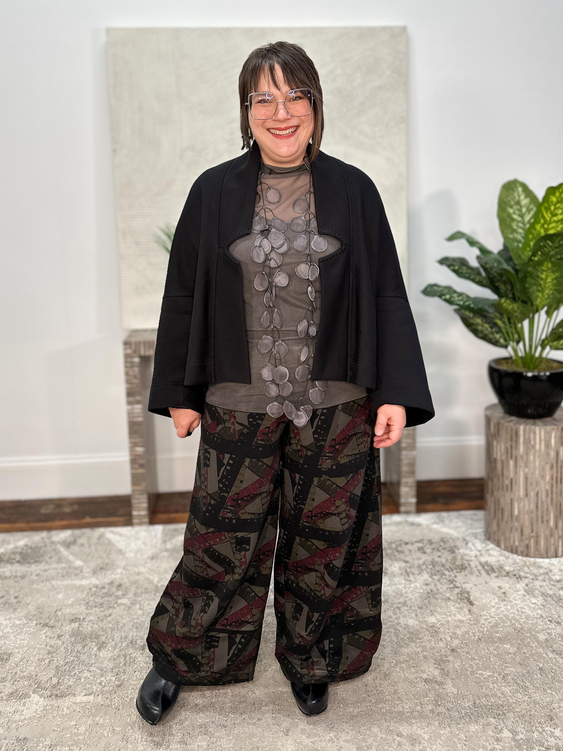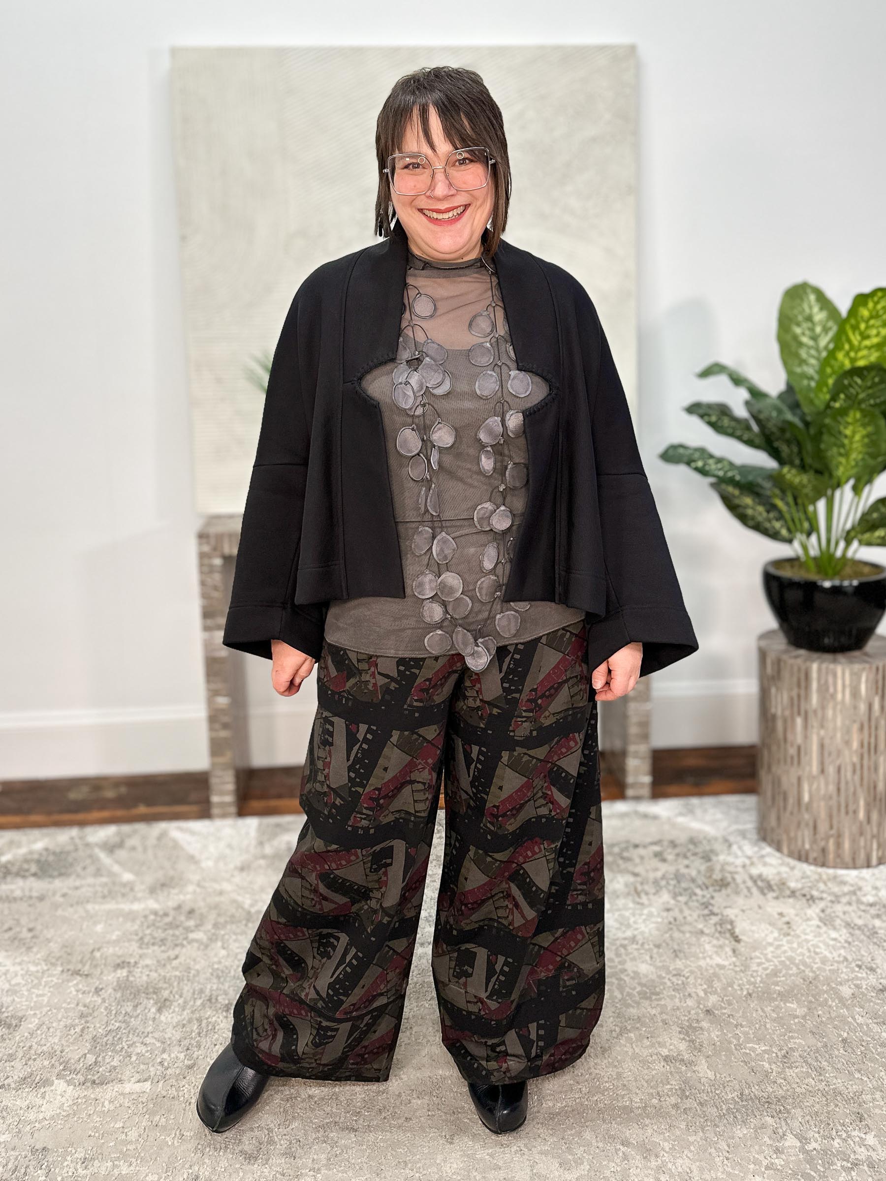 The Stratum Jacket is an artful layer in cozy fleece-backed sweatshirt knit, shaped into a cocoon kimono silhouette with a sculptural envelope-folded body. The front lapels feature a distinctive notch detail finished with whipstitching, a design element echoed by the diamond-shaped stitched embellishment at the center back. Effortlessly blending comfort with avant-garde edge, this jacket captures Kedem Sasson’s signature balance of form and artistry.