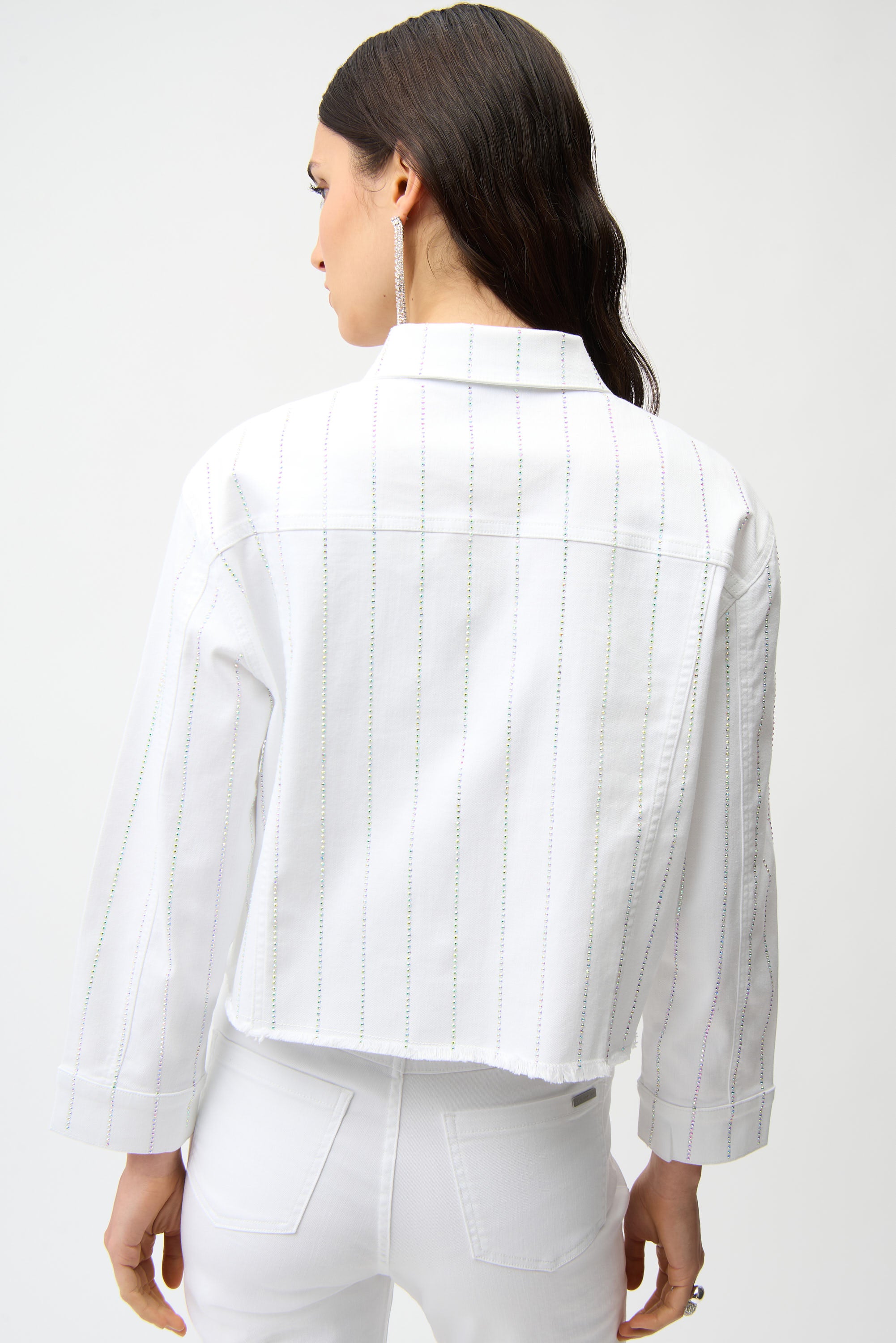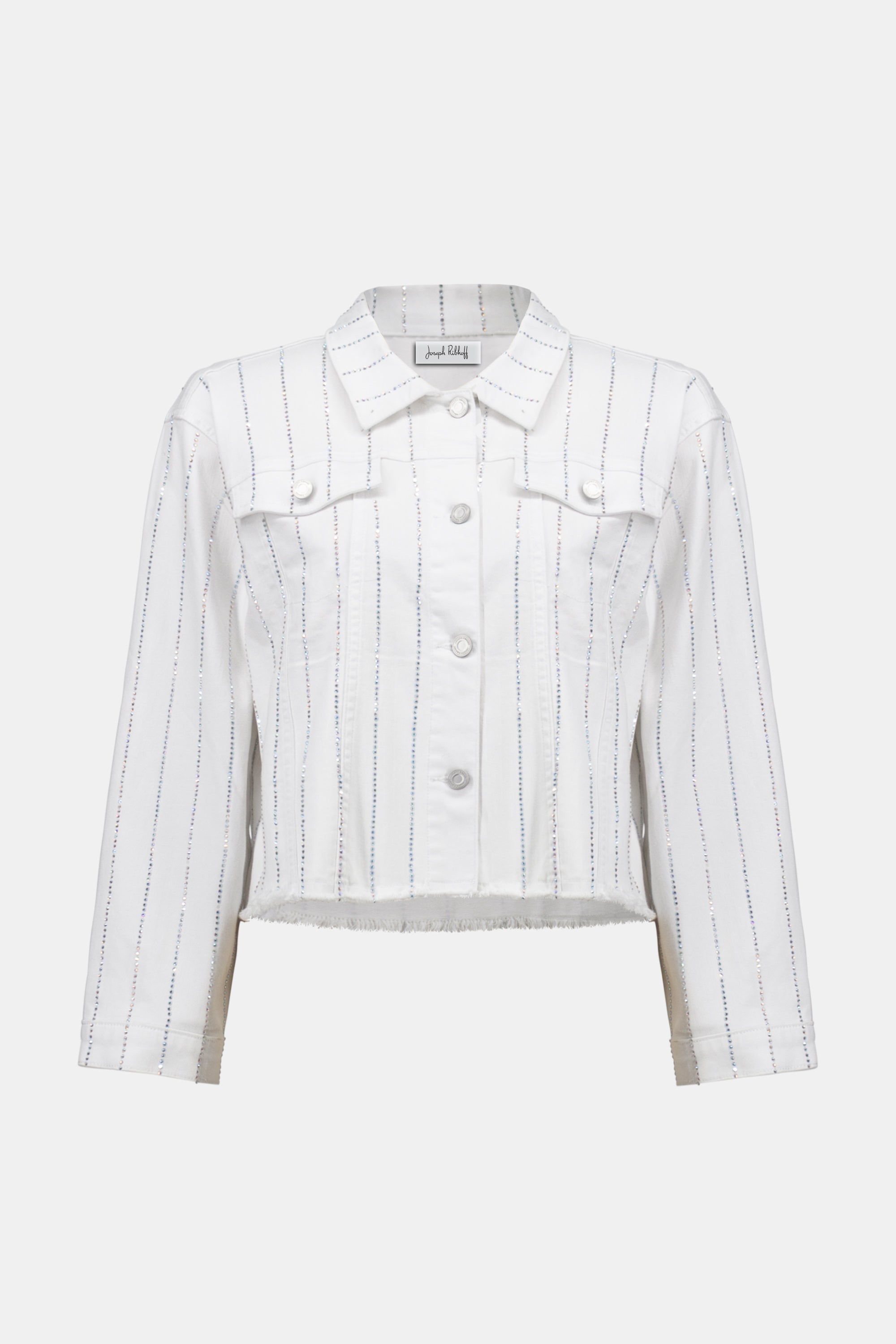Lightweight and full of attitude, this Joseph Ribkoff FEATHERWEAVE™ denim jacket features shimmering aurora borealis rhinestone accents, a frayed hem, and a classic shank button front. Joseph Ribkoff FEATHERWEAVE, made from a lightweight modal blend, super soft-to-touch stretch fabric.