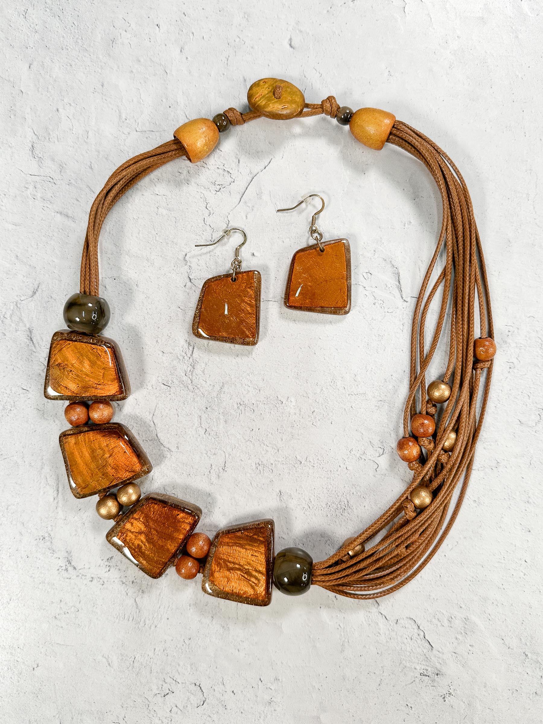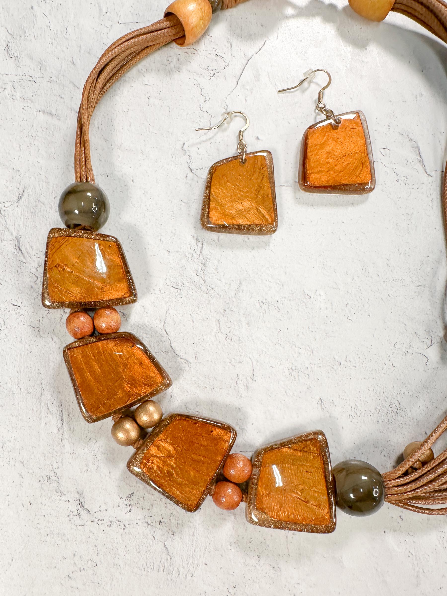 Asymmetric Resin & Wood Bead Necklace & Earrings Set, Gold/Brown