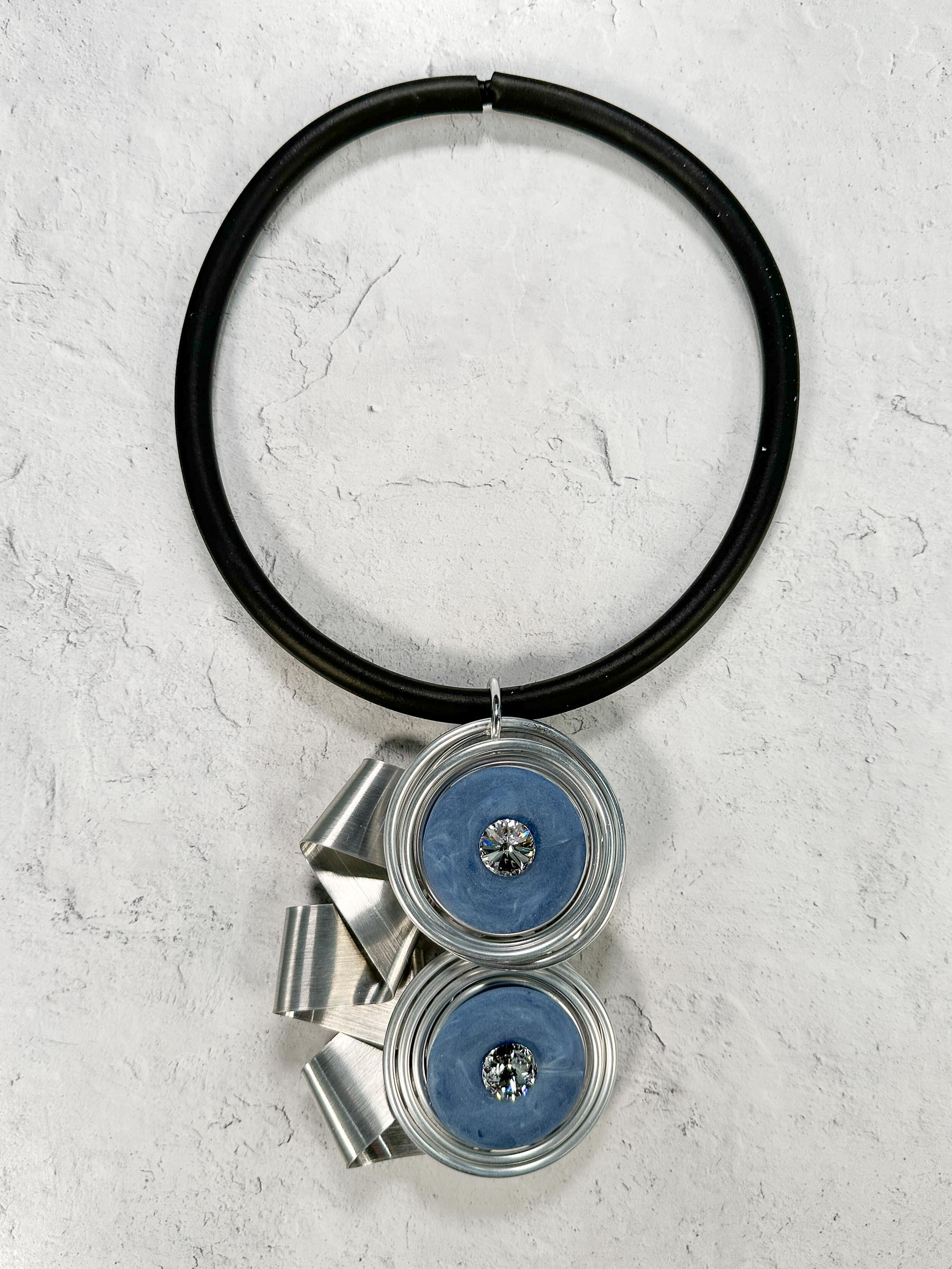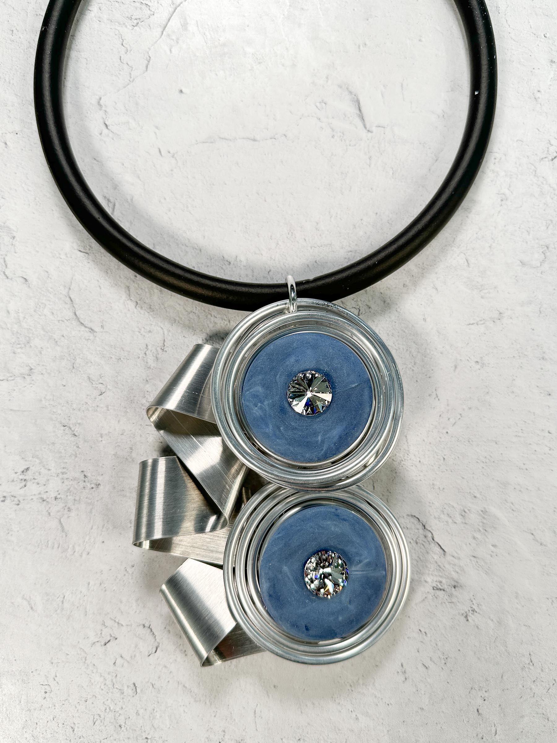 Resin & Wire Ribbon Pendant Rubber Necklace, Blue/Silver