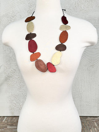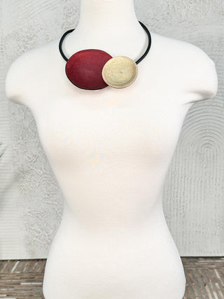 The Large Fortune Fold Drop Earrings feature a large rounded focal shape with a soft “fortune cookie” fold at the center, dropped from two varying sizes of leather rounds. The largest shape is crafted in metallic burgundy, accented with gold and brown for an artful mix of tones. Finished with post back ear wires, these lightweight drops bring sculptural dimension with effortless wear.