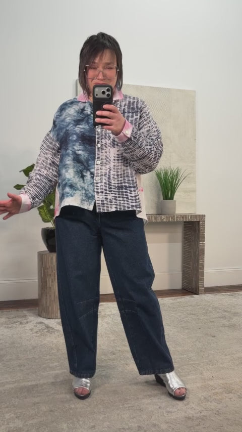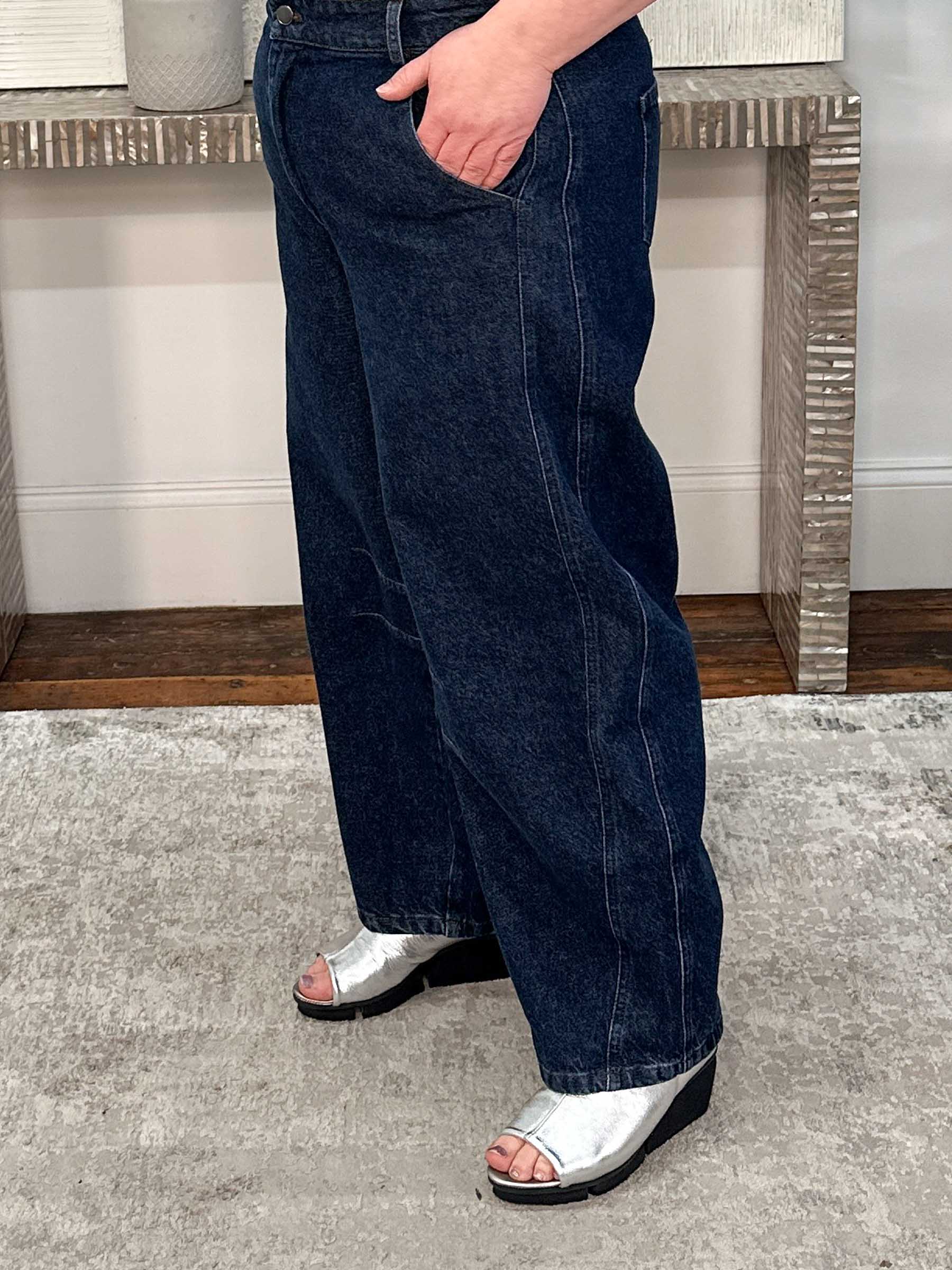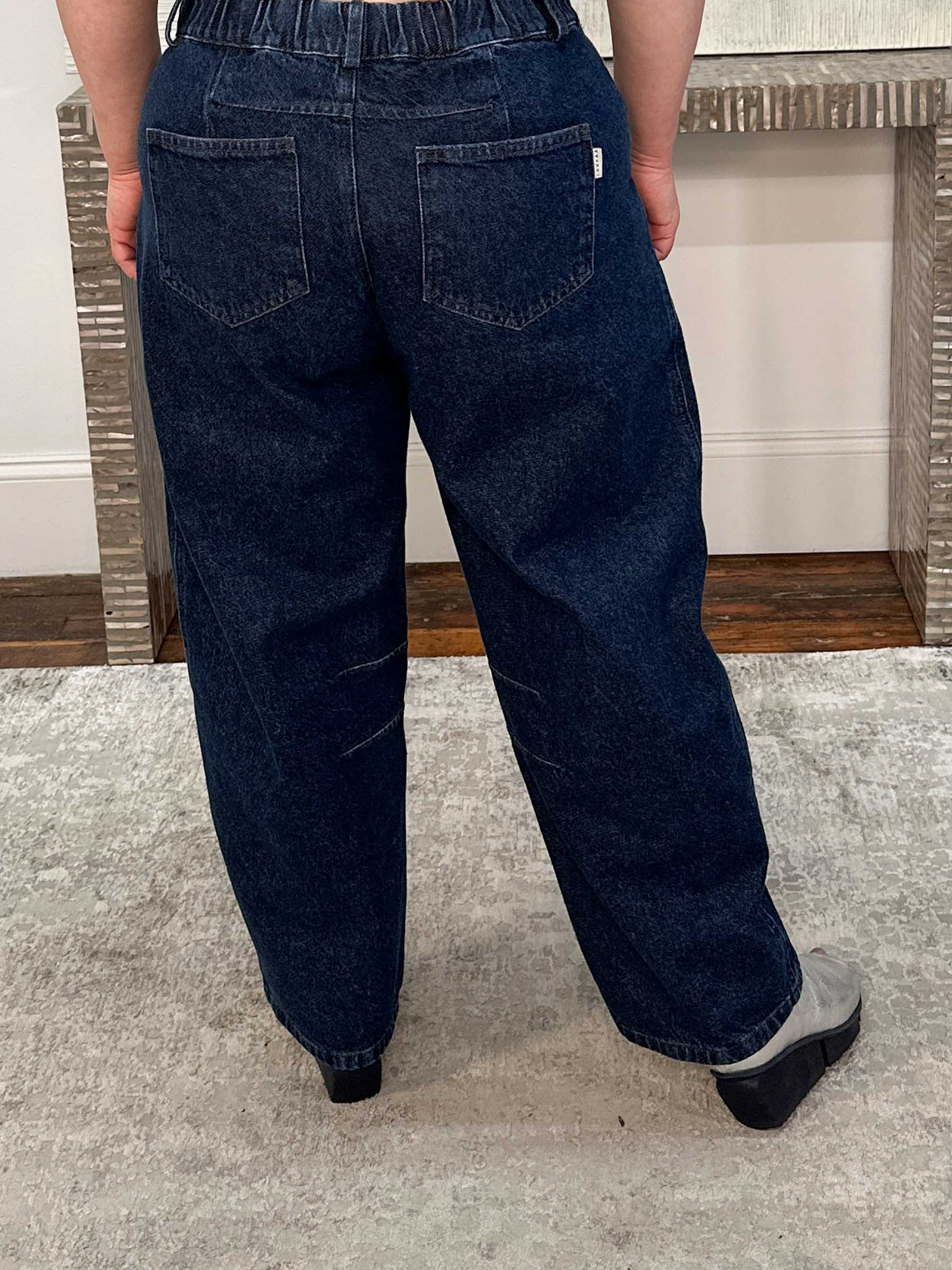 The Nila Barrel Jeans by Luukaa deliver a modern take on denim with a contemporary cropped barrel silhouette crafted in dark rigid, non-stretch denim for a clean, structured look. Designed with relaxed barrel legs, this style features side seam detailing and inseam darts at the knee that shape the leg for a flattering, architectural effect. Classic denim details include a zip-and-button fly, elastic at the back waistband for added comfort, and side seam pockets with rear pockets to complete the design. Balanced and thoughtfully proportioned, this cropped barrel shape offers a fresh, flattering profile that feels modern without being overly full.