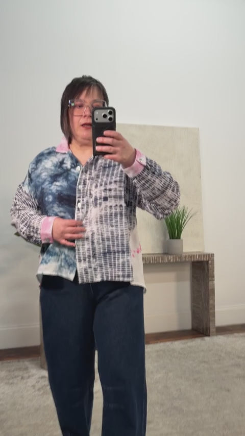 The Noma Oversized Shirt by Luukaa is an artful statement piece crafted in breezy gauze with a mix of expressive prints in blues, pinks, and reds. Designed with a relaxed oversized silhouette, this button-front style features a short collar that can be worn standing up or folded over for versatile styling. A soft high-low hemline adds easy movement, while long dropped sleeves with cuff detailing enhance its laid-back elegance. The front and sleeves showcase contrast blue and white prints, complemented by a soft pink print at the collar and sleeve cuffs. At the back, an allover cherry blossom print in navy, red, and pink creates a striking, unexpected finish that elevates this standout piece.