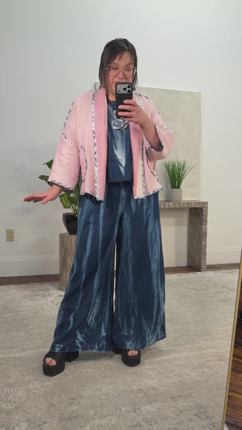 The Noma Short Reversible Jacket by Luukaa offers two distinct looks in one effortless layering piece, crafted in breezy cotton gauze with a soft, Kantha-inspired feel. Designed in a short boxy silhouette, it features a curved hemline, front pockets, dropped three-quarter sleeves, and an open fold-over lapel for relaxed structure. One side showcases a soft pink ground accented with blue printed piping throughout, while the reverse reveals a striped pattern with coordinating piped details. Lightweight and artful, this reversible jacket is an easy finishing layer that adds texture, dimension, and endless styling possibilities to any look.