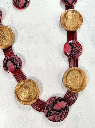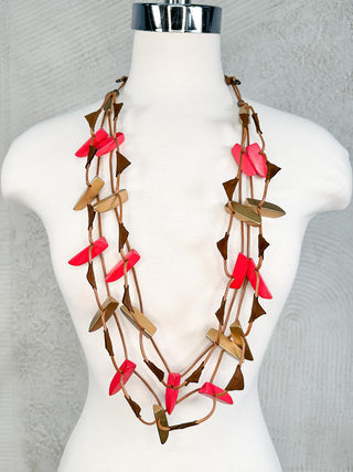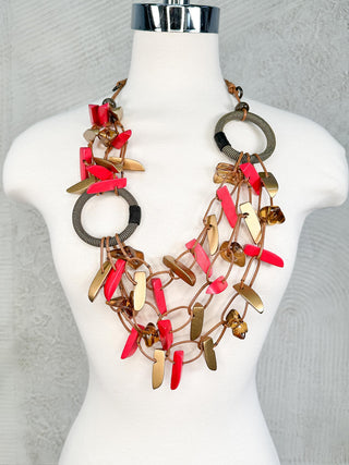 Wood Mixed Media Shapes Wire Necklace, Pink Multi