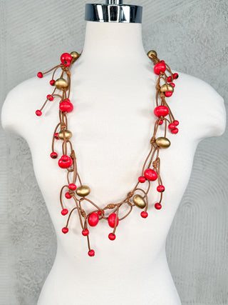 2 Strand Wood Bead & Leather Accent Necklace & Earrings Set, Gold/Red
