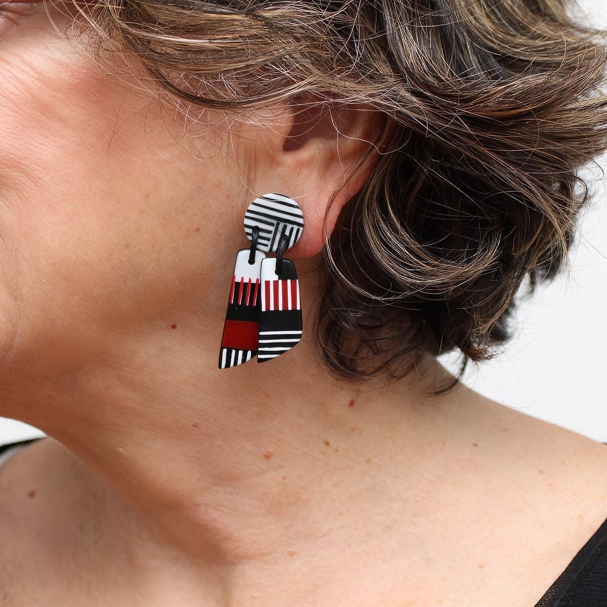 Perfect for adding a splash of color and a touch of artistic flair to your ensemble, these hand-painted resin earrings are versatile enough to complement both casual and formal looks. The black and red mixed with a dynamic pattern add a cheerful and playful touch to any outfit. Hung on a post, you can easily wear these earrings alone or with a coordinating necklace. Earrings hang 1" in length Care Instructions: Remove jewelry when applying perfumes, creams, washing hands, etc. Do not store in direct sunlight. To restore color and shine, apply a drop of oil with a soft cloth.