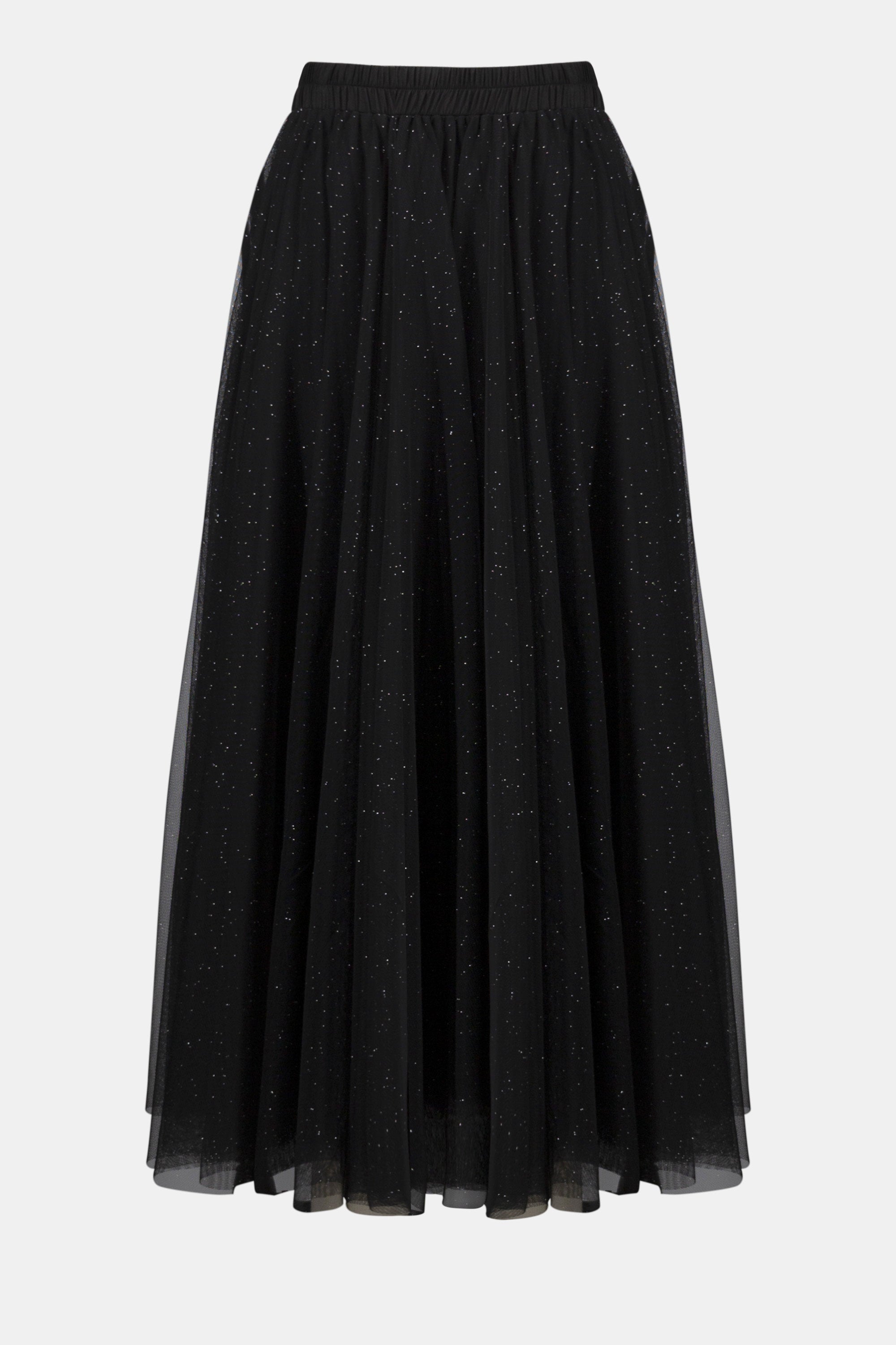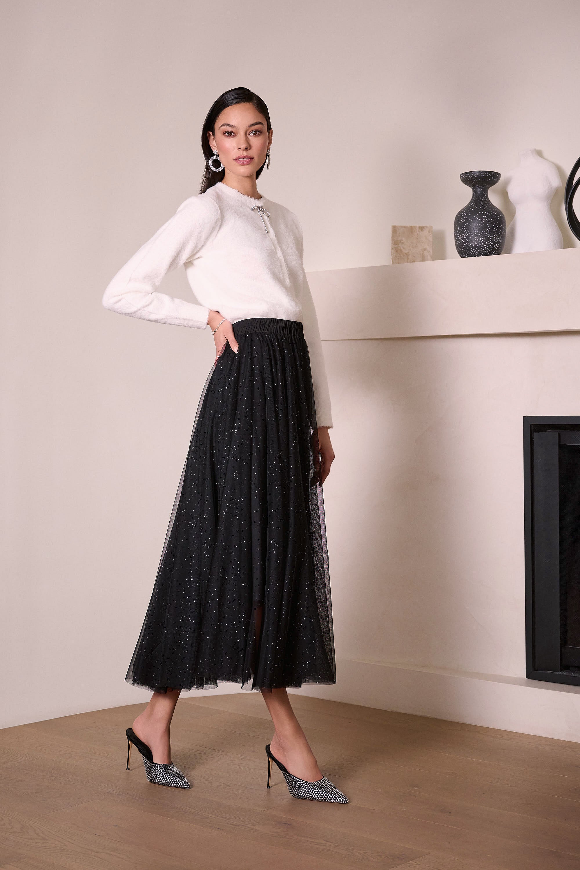 Crafted from lightweight tulle and fully lined, this pull-on skirt is flirty, feminine, and effortlessly versatile. Its flared silhouette adds volume and movement, making it a chic statement piece for any occasion.