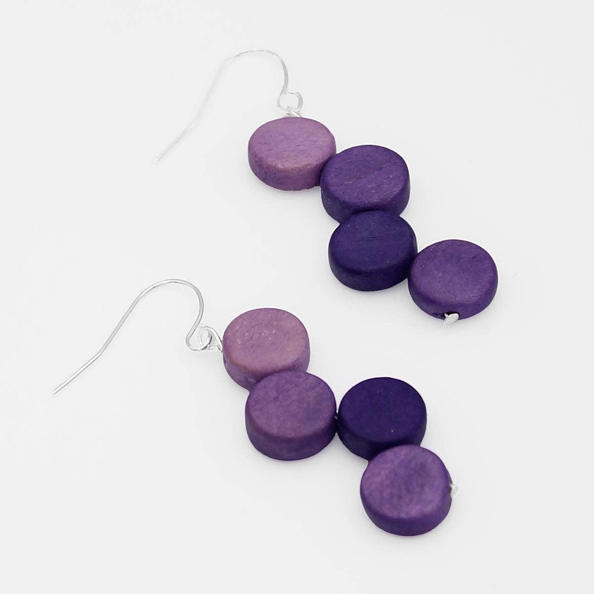 These purple color dangle earrings feature four small wooden beads that dangles off a silver plated wire for a look that will surely stand out! Wear them solo for an understated look, or pair them with a coordinating statement necklace for a more complex, accessorized expression! The earrings are about 2 inches long, and the hook is silver plated. Care Instructions: Remove jewelry when applying perfumes, creams, washing hands, etc. Do not store in direct sunlight. To restore color and shine, apply a drop of oil with a soft cloth.