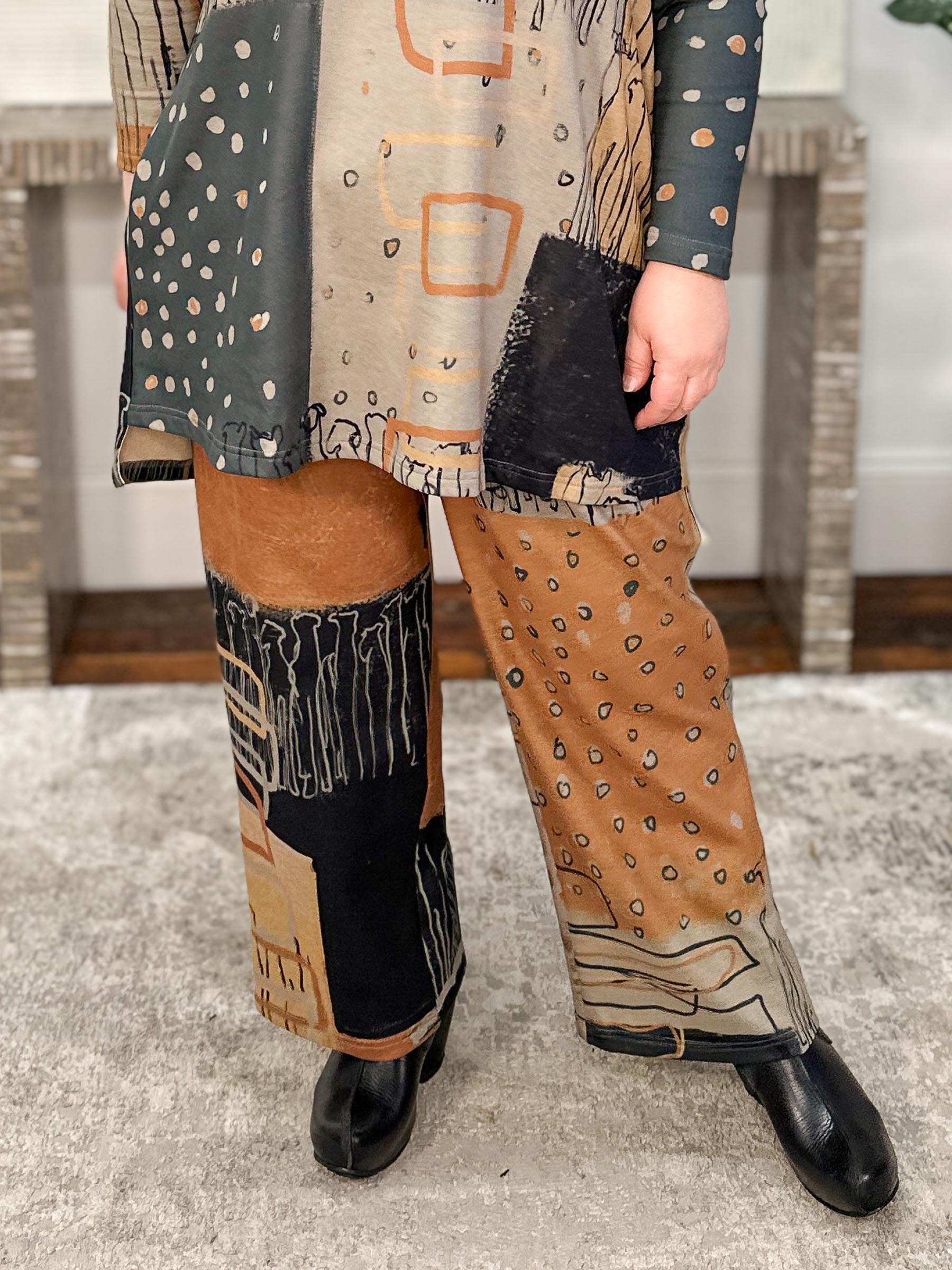 The Straight Leg Pant in Dog Print is a relaxed, statement-making style crafted in a cozy brushed knit with an all-over abstract pattern that subtly reveals a dog motif. Designed with an easy straight-leg silhouette, it offers a comfortable yet polished look that pairs effortlessly with tunics and tops alike. The banded pull-on waistband ensures a smooth fit, while side-seam pockets add everyday functionality.