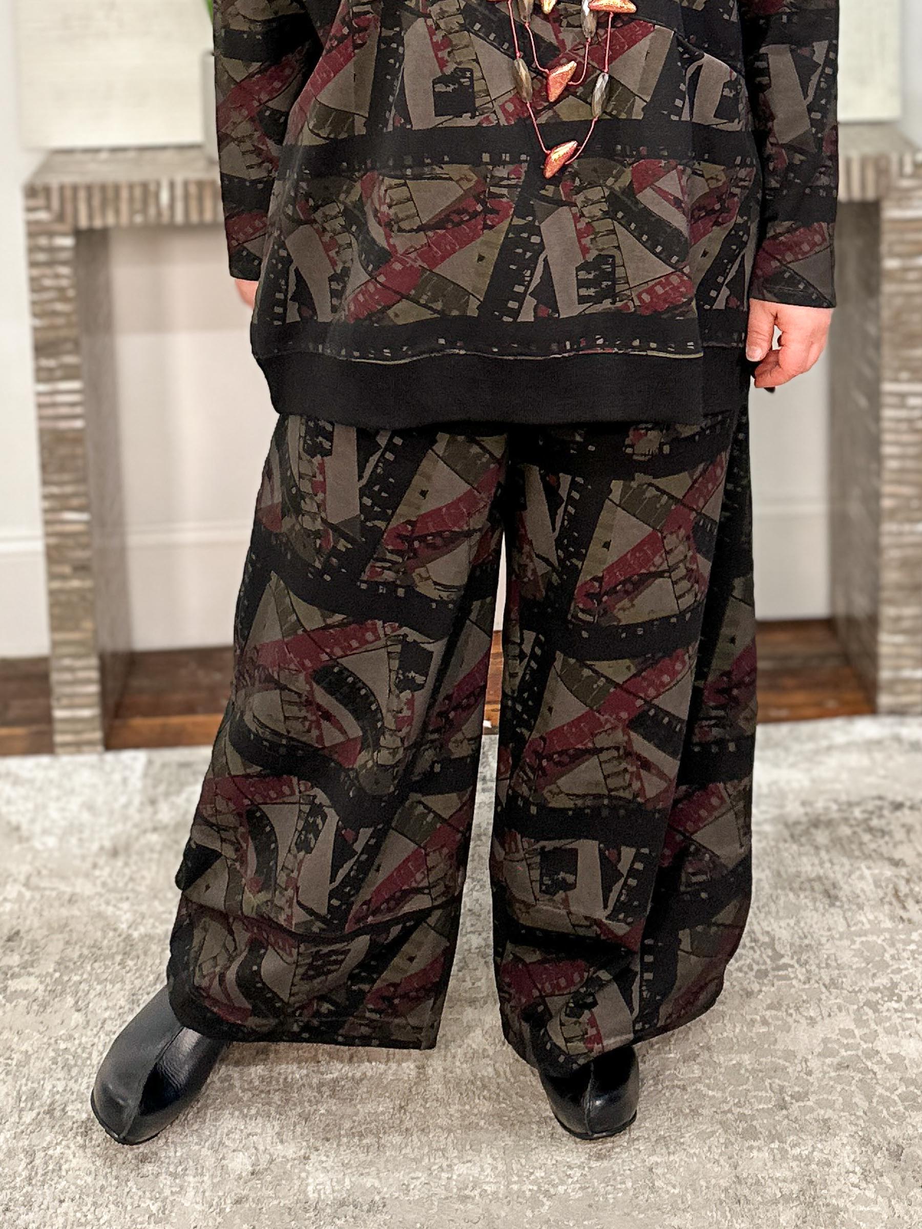 The Cinema Pant in Smoky Print is part of the Cinema capsule, showcasing a deep garment-dyed multi-color print that evokes the look of crosshatched film strips in an artful, abstract pattern. Designed in a relaxed silhouette, this style features wide legs with a distinctive lantern-style panel at the hemline for soft volume and movement. The banded pull-on waistband and side pockets are trimmed in black ribbed knit, adding texture and contrast. Comfortable yet statement-making, the fit is easy and slightly generous, offering artful style with everyday ease.