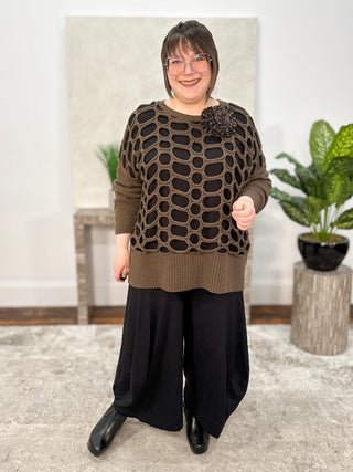 he Open Knit Sweater Top is a cozy yet artful style in a rich brown sweater knit, featuring a honeycomb open knit pattern at the front that adds depth and texture. A black jersey knit panel is layered behind the open weave, offering coverage without the need for an extra layer. The boxy silhouette is finished with ribbed knit trim at the wide banded hem, long dropped sleeves, and a round neckline. With its generous, easy fit and mix of textures, this piece delivers warmth, comfort, and understated sophistication - an elevated essential with a creative twist.