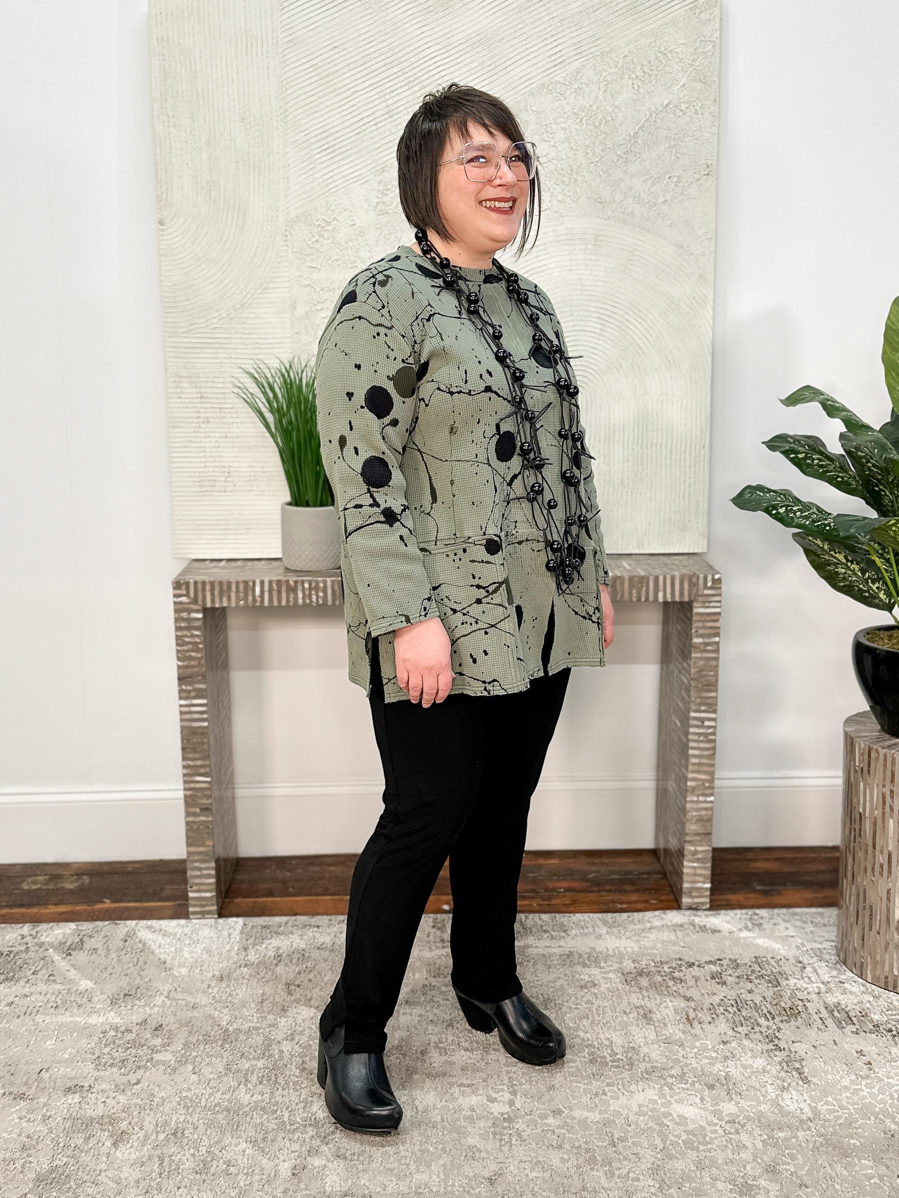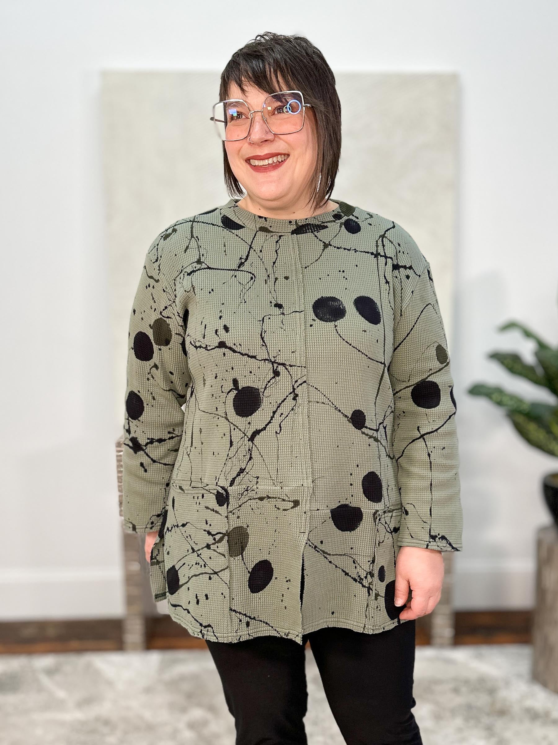 The Dots Penny Top in Moss is an artful everyday piece done in a soft waffle knit that combines texture with ease. Featuring an all-over hand-painted batik design of dots and splatter effects in black and deep green on a soft sage base, it brings a creative twist to a classic silhouette. The slim A-line shape is detailed with patch, panel, and pocket accents that highlight its raw-finished seams, while a front vent at the hemline and side vents add movement. Finished with a round crew neckline and slightly dropped long sleeves, this style is relaxed, distinctive, and effortlessly wearable.