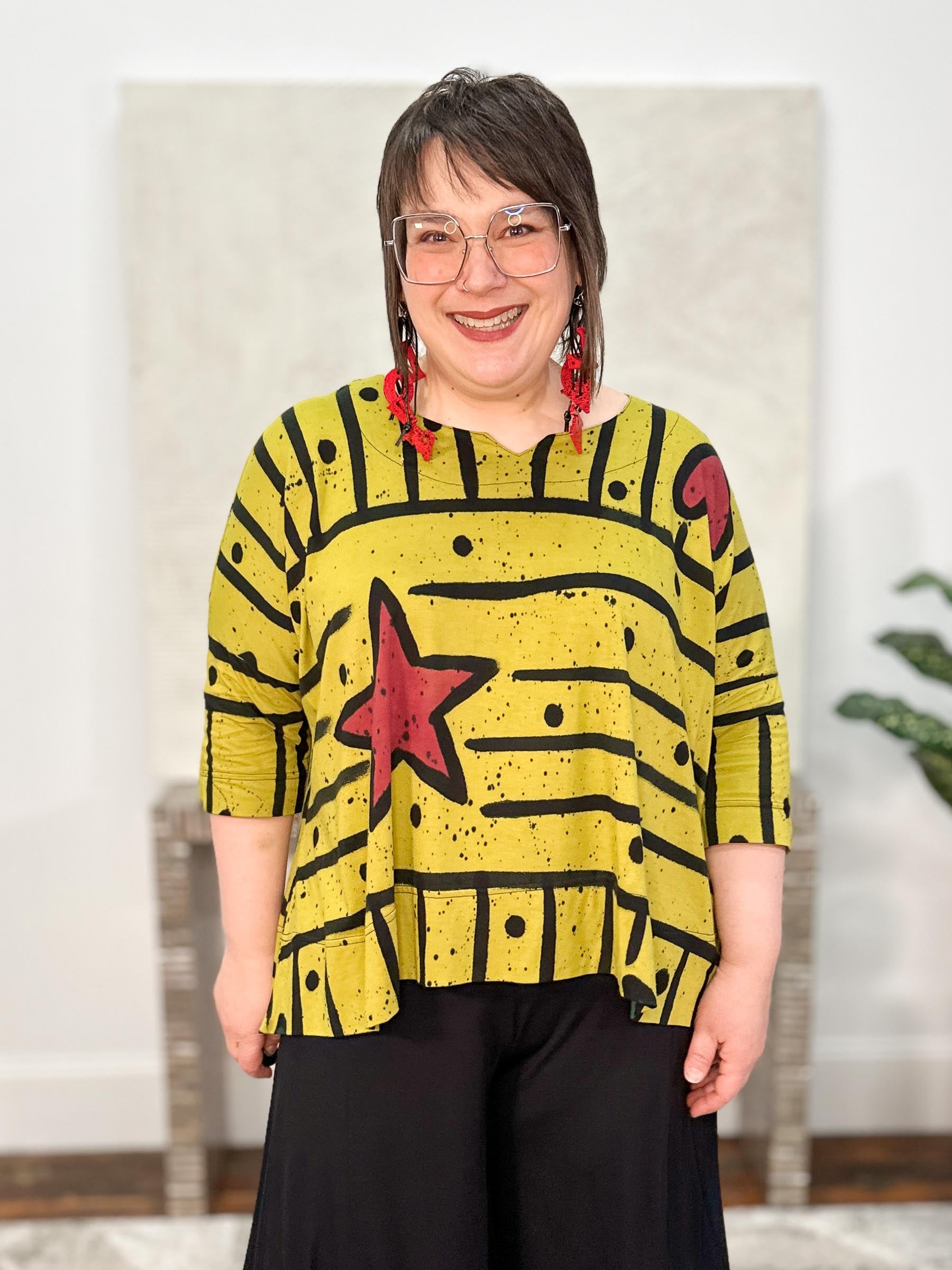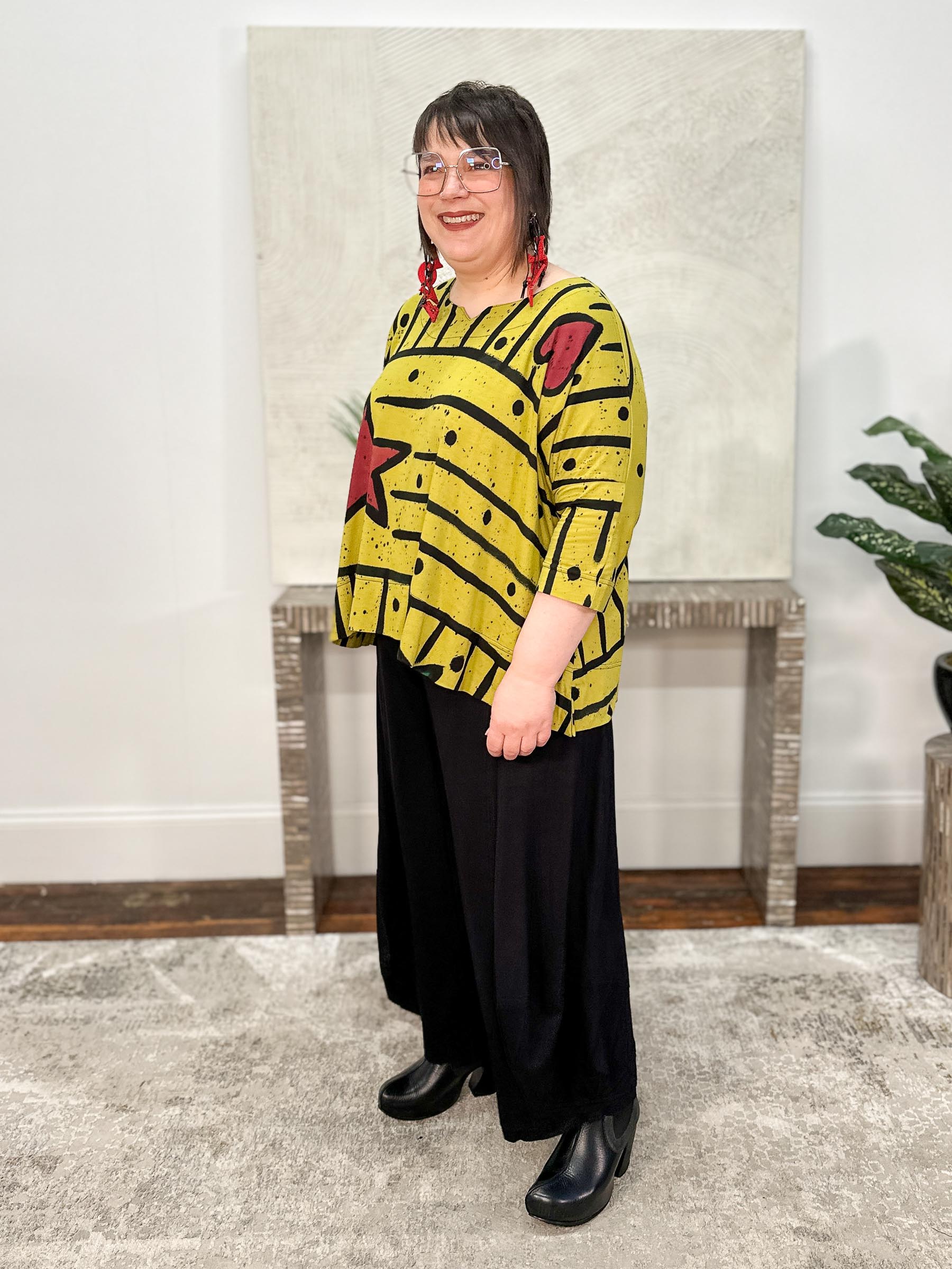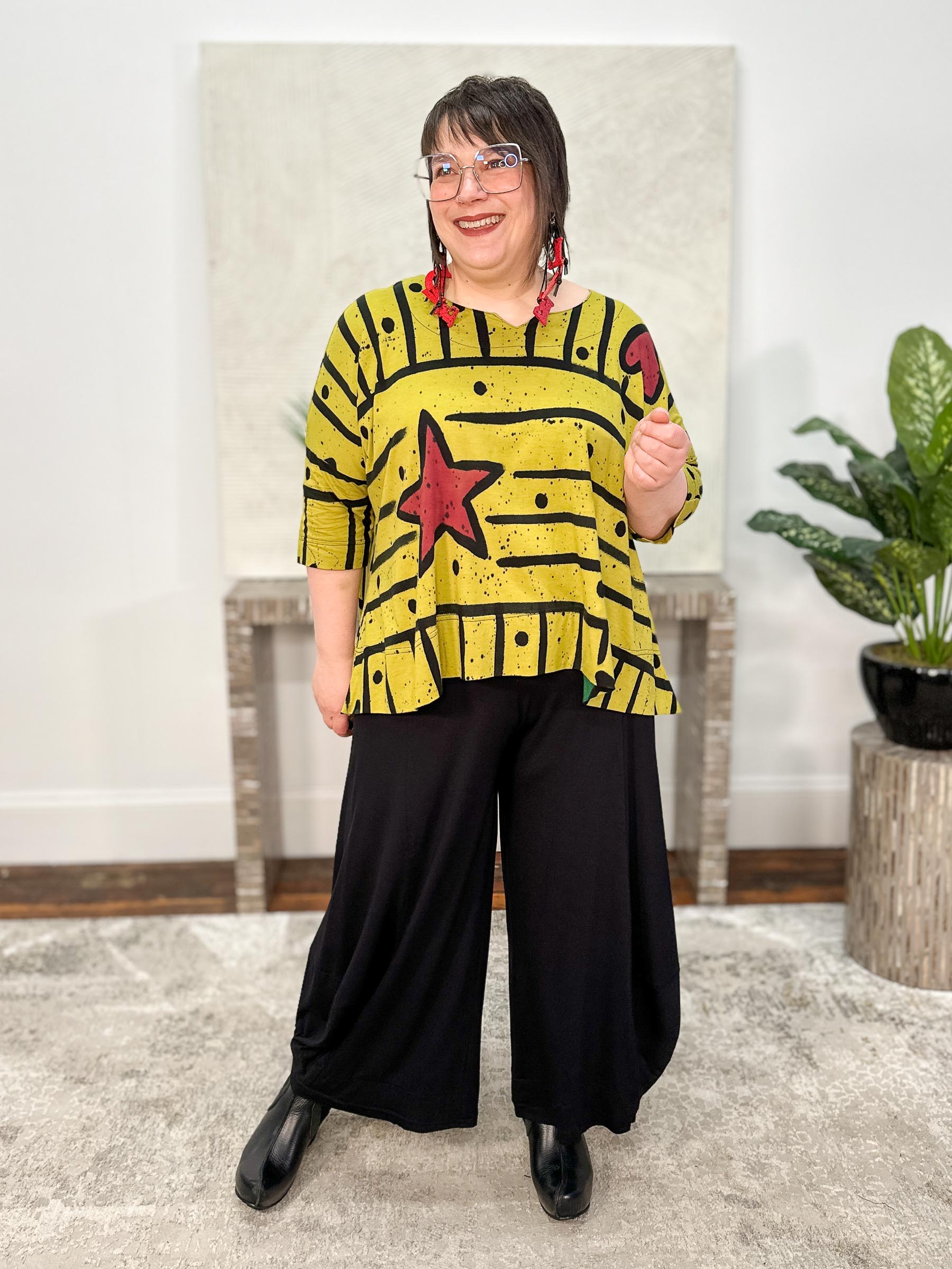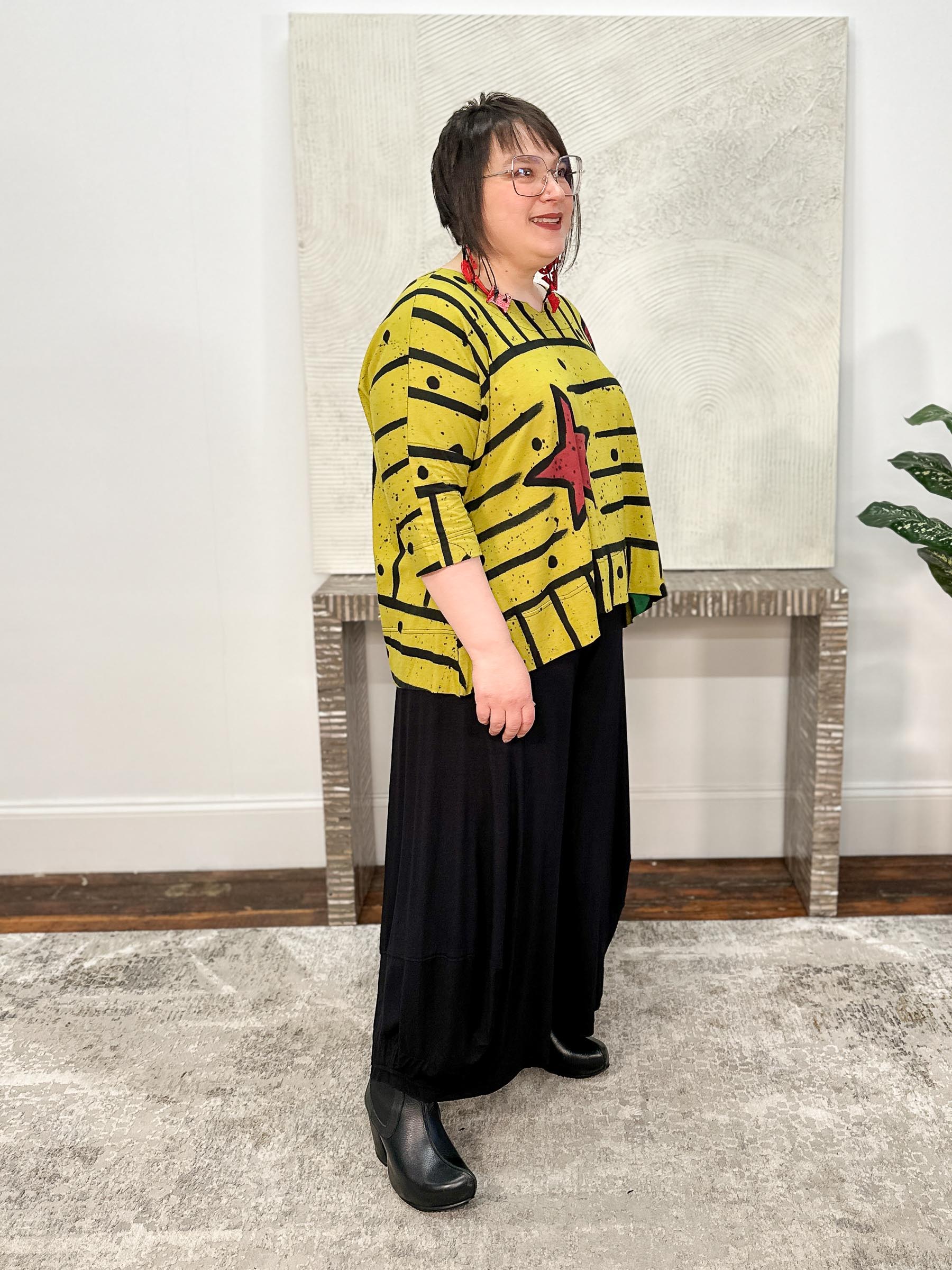 Playful and bold, the Pop Art Greta Top in Pea features a hand-painted batik motif of painterly stripes—both horizontal and vertical—with whimsical star and heart accents scattered throughout. Cut in an oversized, boxy fit, this style offers a relaxed feel with short dropped sleeves and a high-low hemline for easy movement. The wide round neckline is finished with a subtle notch detail at the center, adding just a touch of structure to this one-of-a-kind, art-inspired piece.