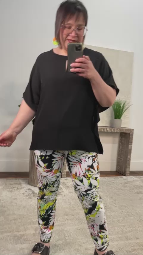 Breezy and modern, this woven twill poncho top is designed with an easy elegance that transitions seamlessly from day to night. Featuring a round neckline with a front keyhole slit, short dolman sleeves, and a relaxed, poncho-inspired silhouette, it drapes beautifully with soft fluttering sides for added movement. The silky, smooth handfeel gives it an elevated finish, while the even hemline hitting at the hip makes it effortless to style with everything from slim pants to flowy trousers. Dress it up or down with ease—this is one of those pieces that always feels just right.