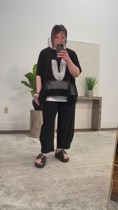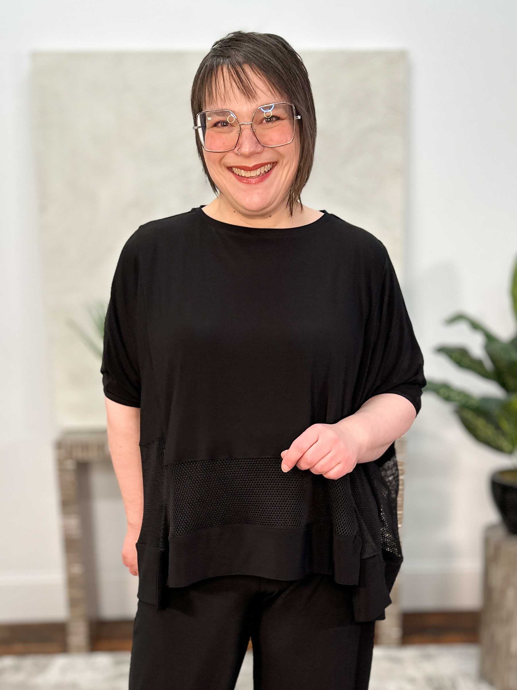 Modern and artful with effortless volume, the Dewey Top, Network features an oversized boxy silhouette that softly drapes in Kozan’s Truli fabric, a heavier-weight stretch jersey knit known for its smooth handfeel and structured flow. A round neckline and short dolman sleeves keep the look relaxed and easy. The stepped hemline—longer at the sides and shorter at the front and back— is finished with inset mesh net panels along the hem, adding depth, movement, and a subtle sheer contrast. Designed for layering, this style looks especially striking worn over any color tank to show off the net detailing and create endless styling possibilities.