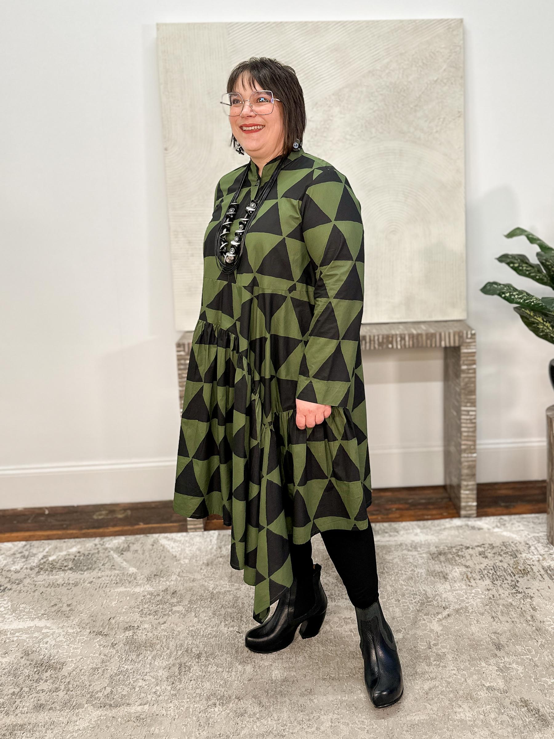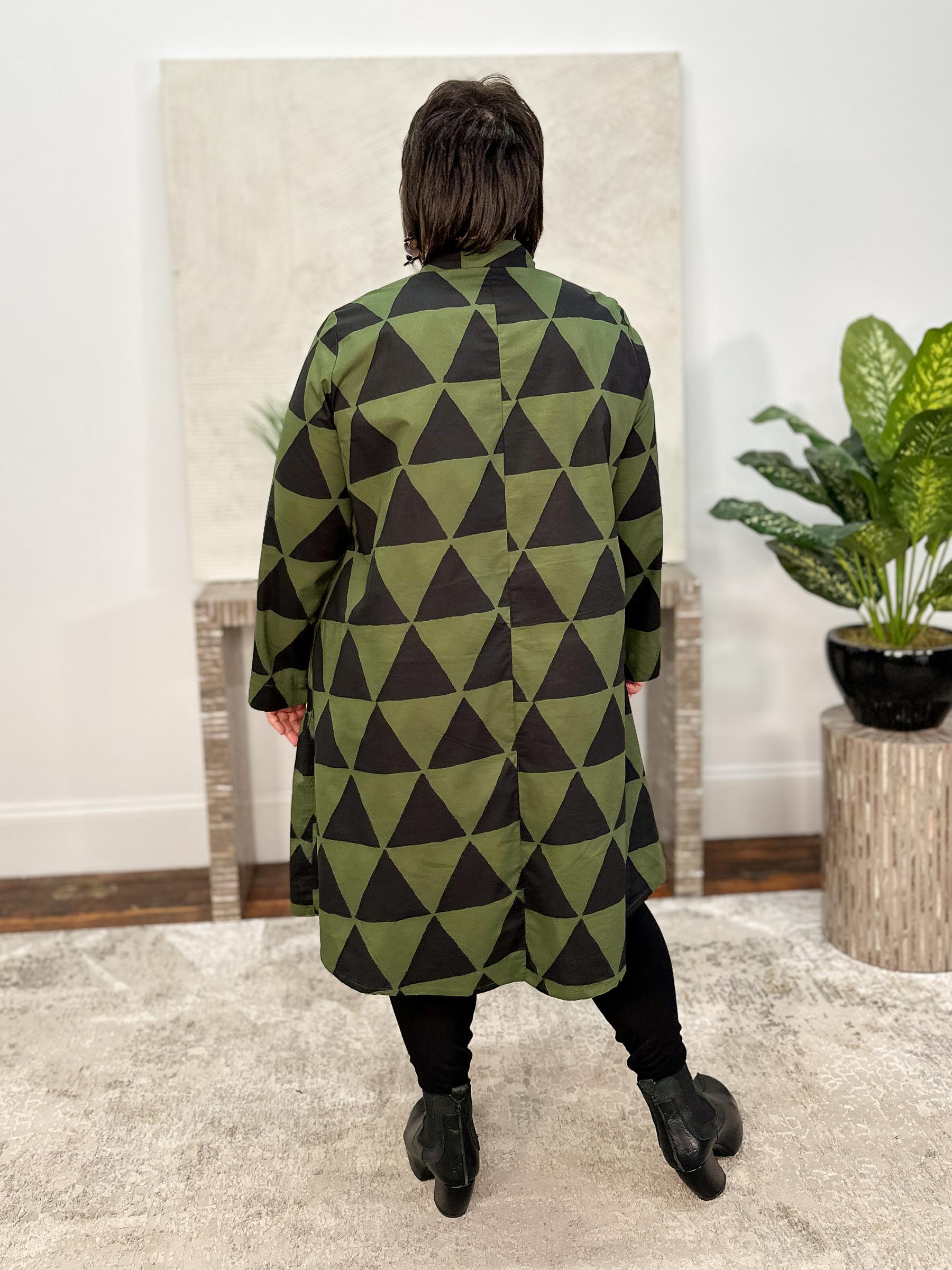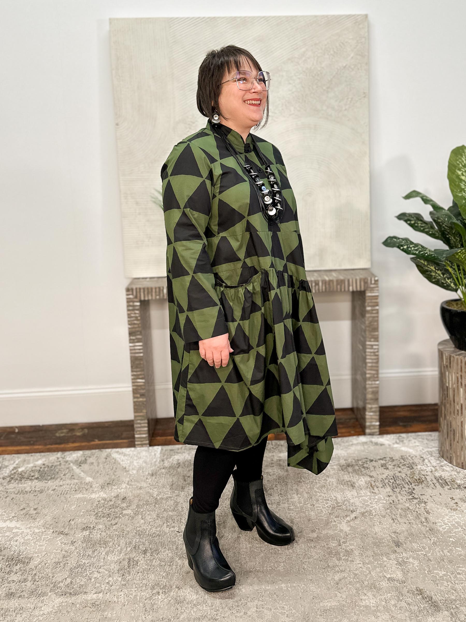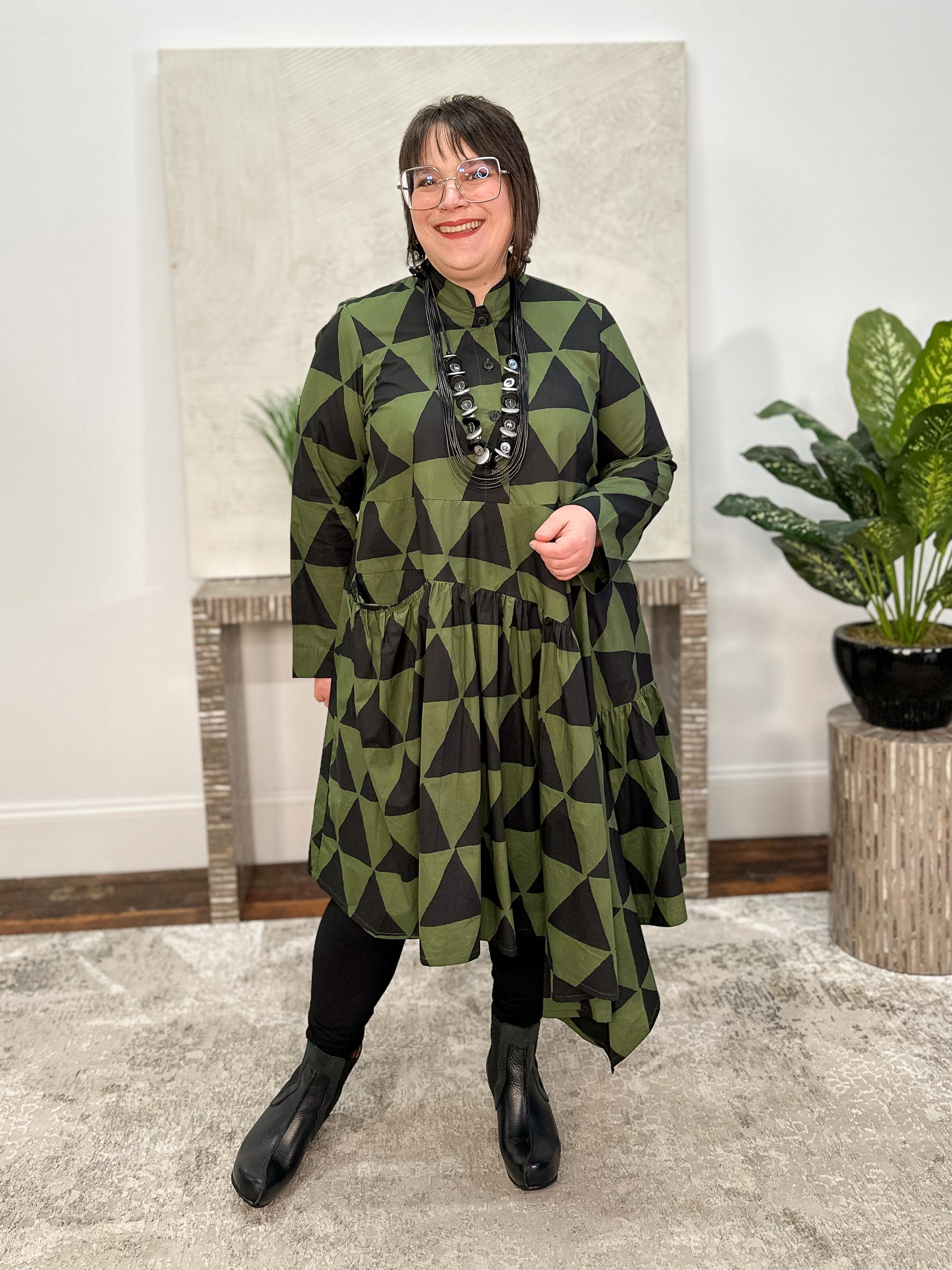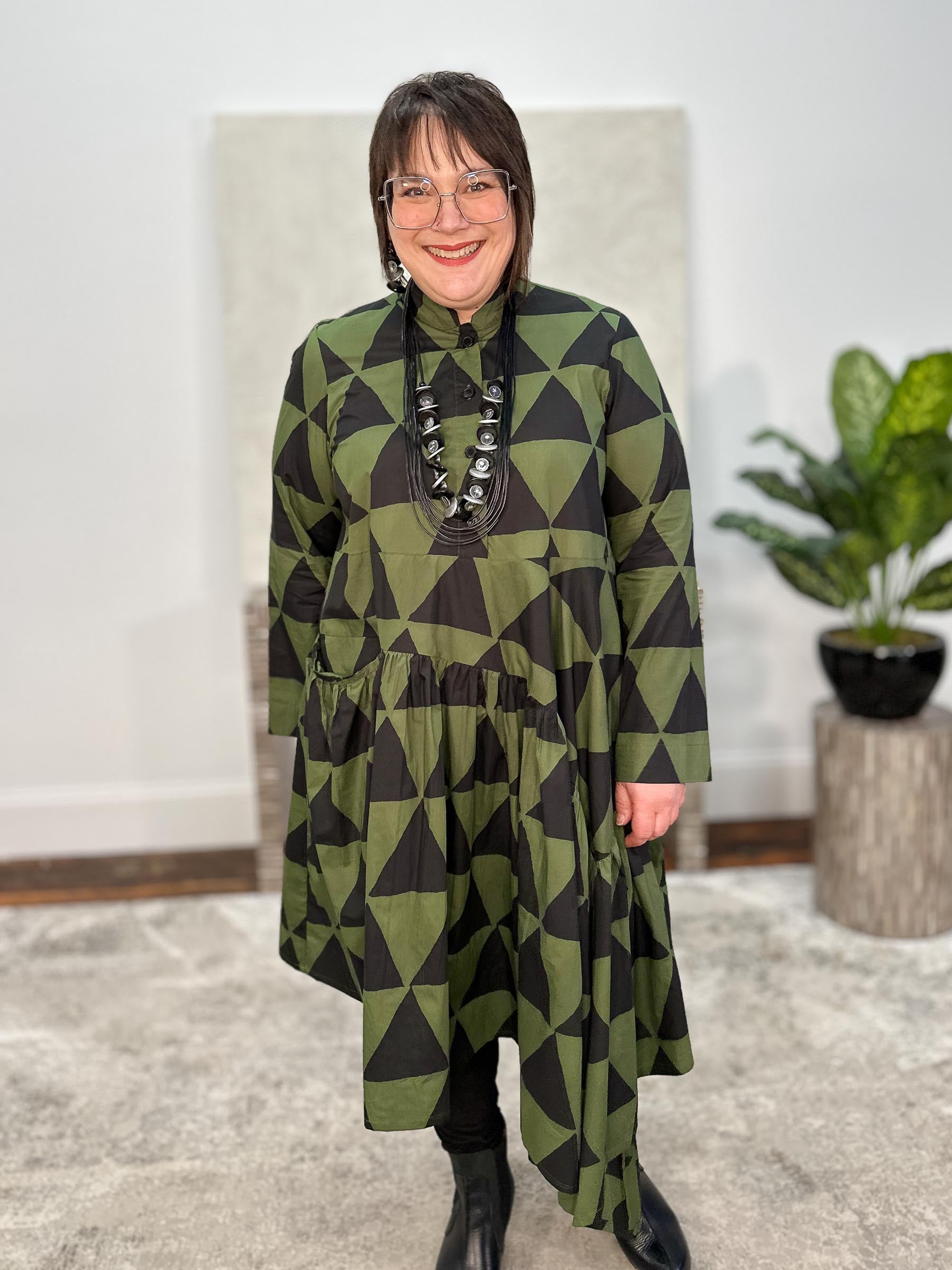 The Elle Shirt is a striking shirt tunic in crisp cotton poplin, showcasing a bold geometric print for modern impact. Designed with a half-button front and mandarin-style collar, it features angled front seams that reveal a pocket accent and subtle gathered detail. Finished with long set-in sleeves, this style flows into an asymmetric hemline that dips to a longer offset point at the front, while the back is defined by a clean vertical center seam for signature Kedem Sasson edge.