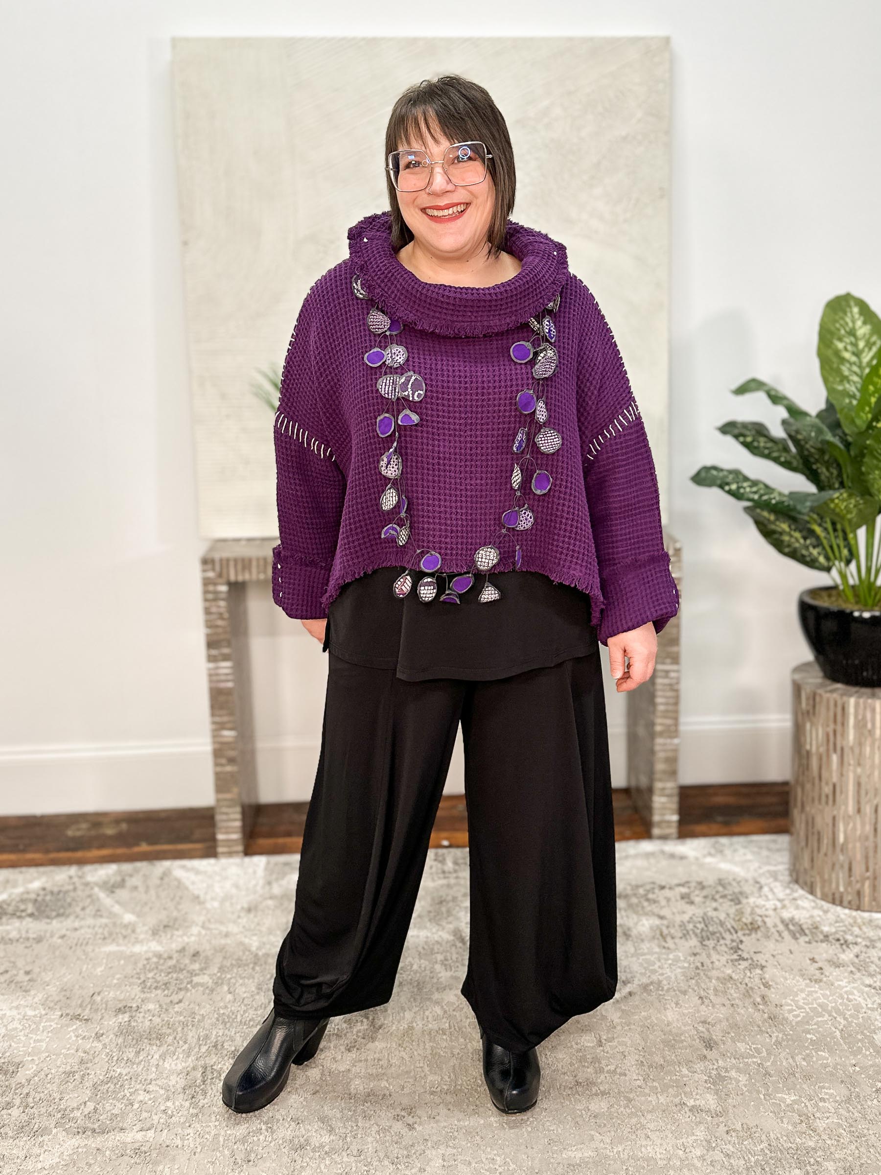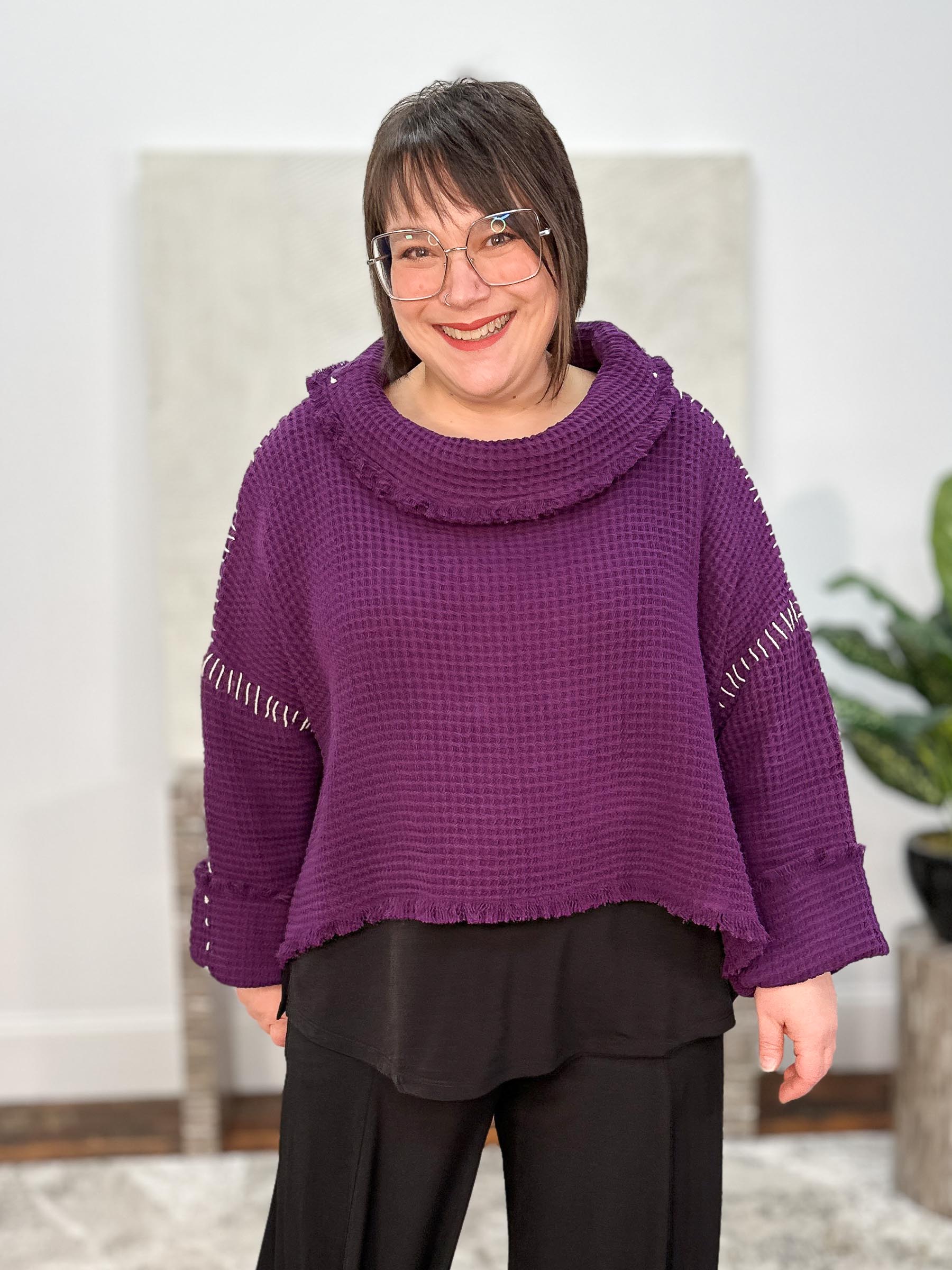 The Lunar Shirt is a standout top in chunky waffle fabric, designed with a flared body that dips at the sides for effortless movement. A wider structured cowl neckline and long dropped sleeves bring modern ease, while creamy embroidered contrast stitching traces the seams for an arty edge. Unfinished frayed edges complete the look, adding a raw, bohemian touch that makes this piece unmistakably Kedem Sasson.