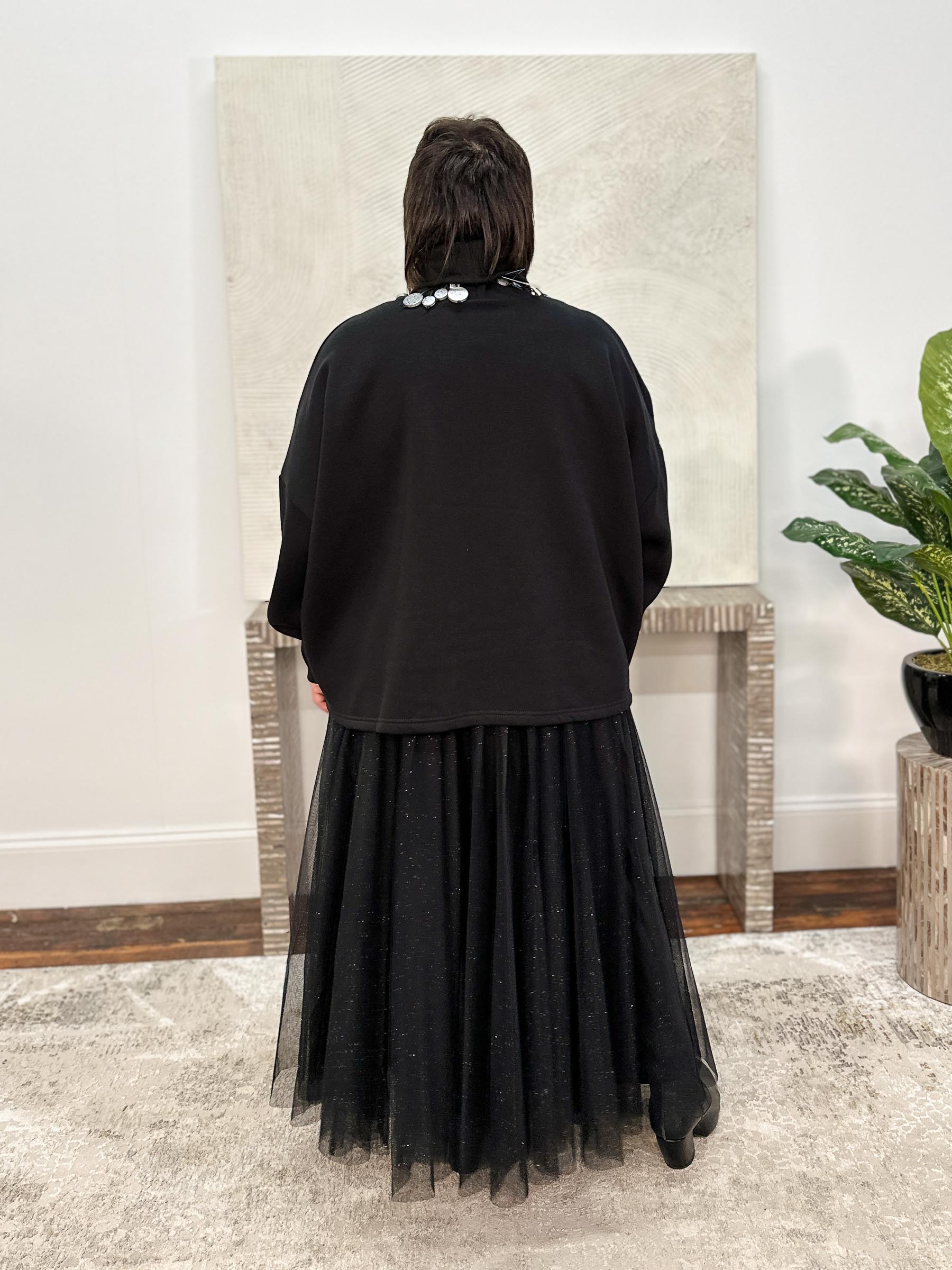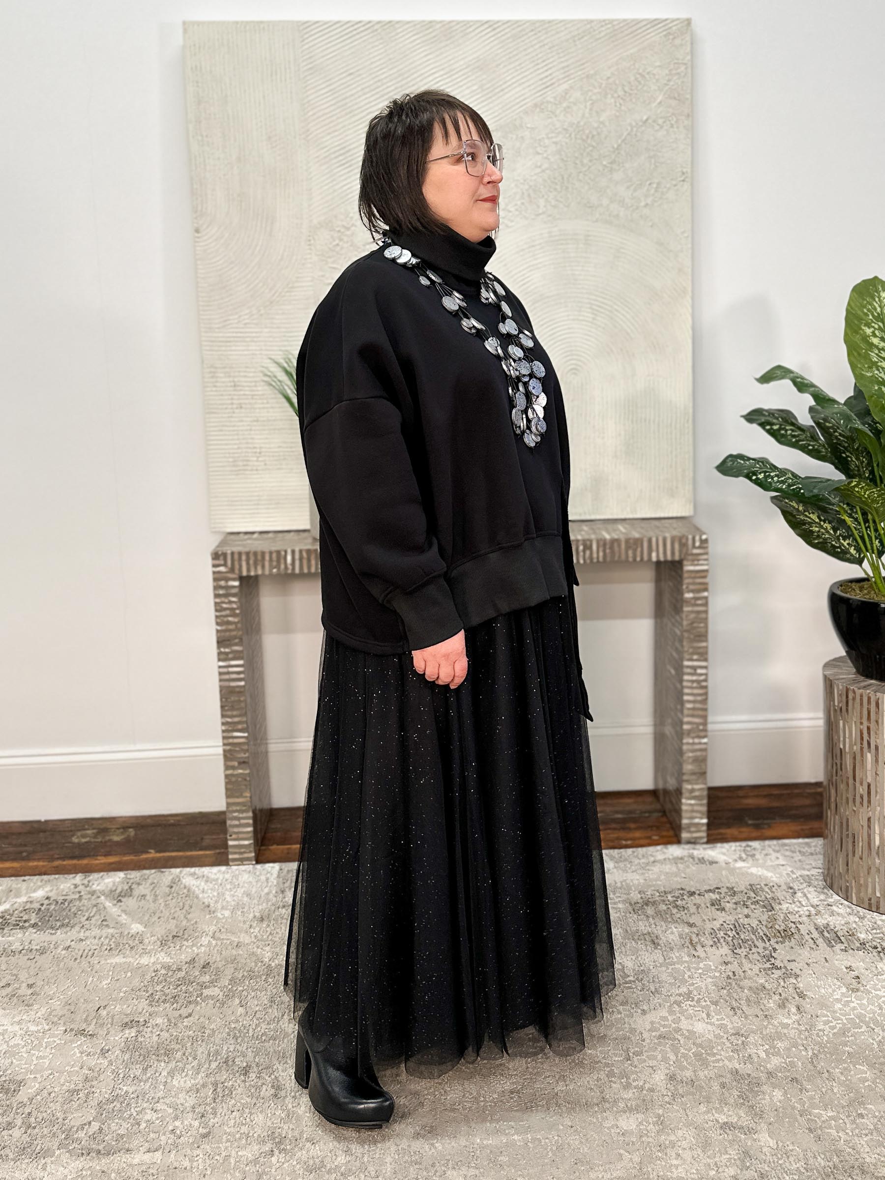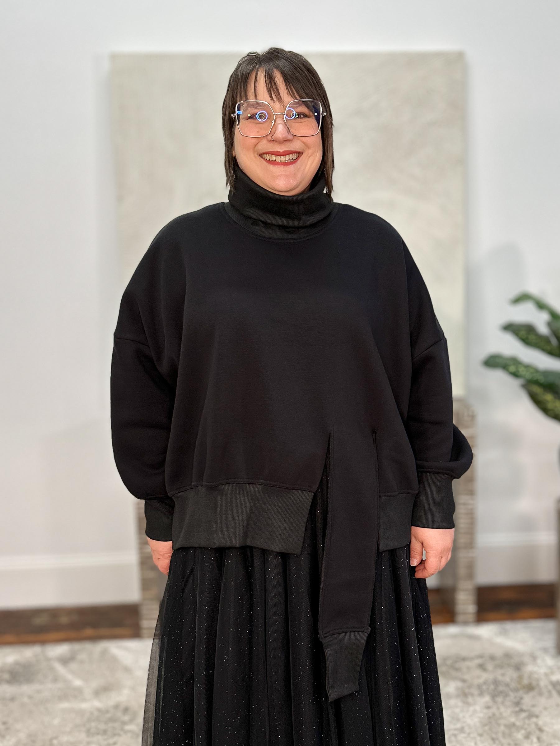 The Tether Shirt, Black is a cozy pullover in fleece-backed sweatshirt knit, designed with an oversized boxy silhouette for relaxed ease. A fold-over turtleneck in ribbed knit echoes the ribbed cuffs and front hemline, tying the details together. Dropped long sleeves balloon subtly yet taper comfortably into the cuffs, while the front hemline features a dramatic offset cut detail with an extended piece that hangs lower for an edgy twist on a casual classic. The back is finished with a softly curved hemline, balancing structure and flow.