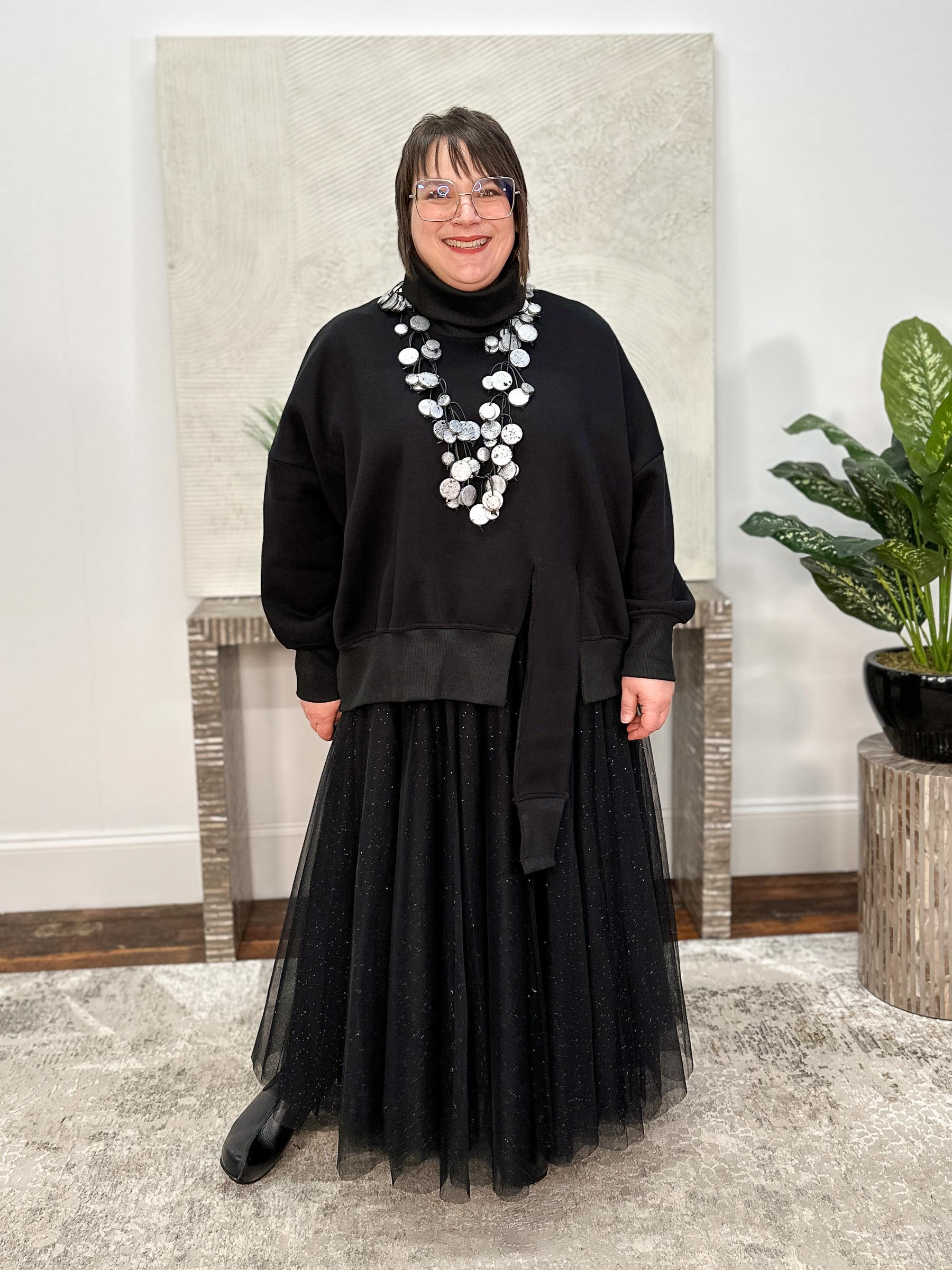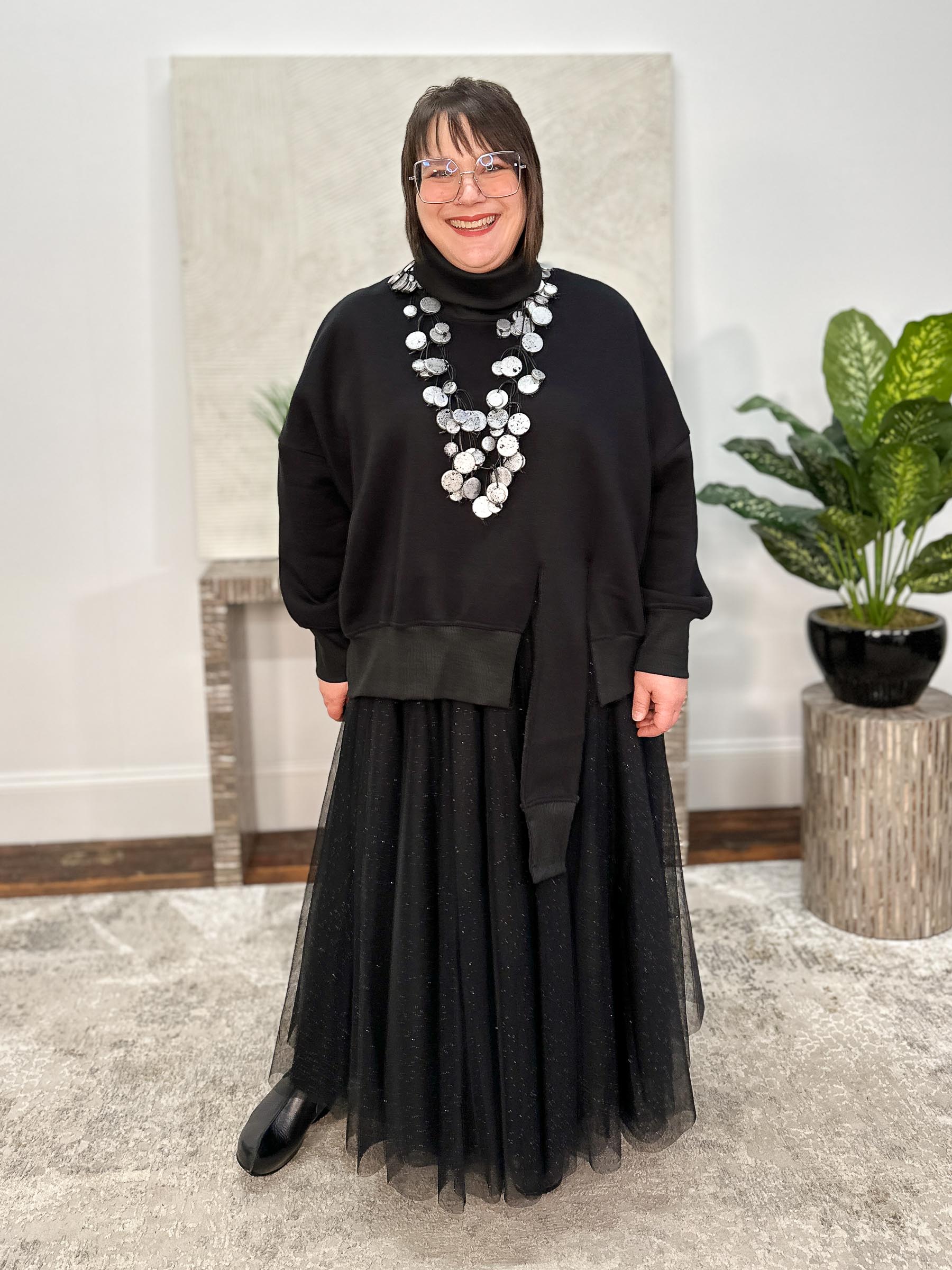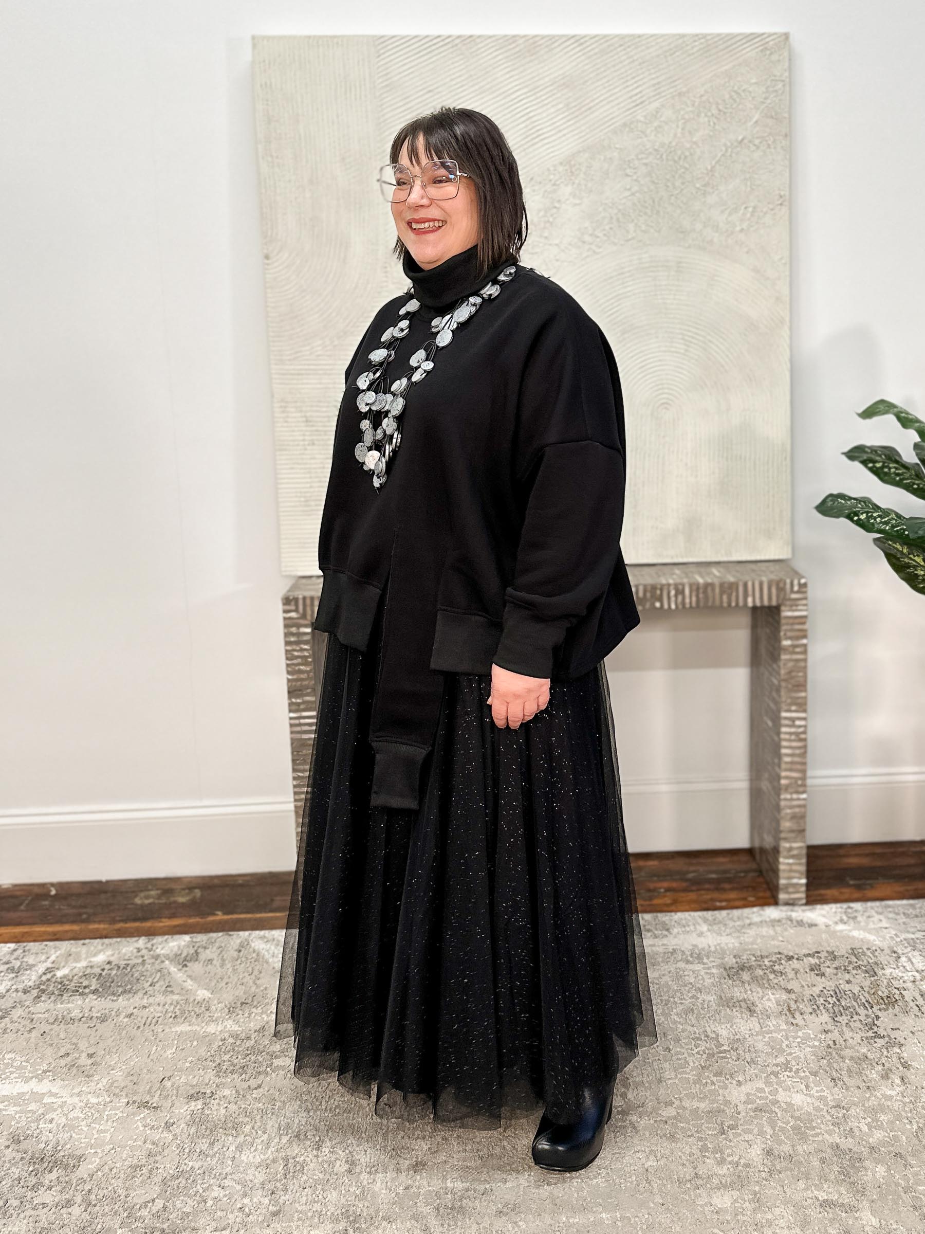 The Tether Shirt, Black is a cozy pullover in fleece-backed sweatshirt knit, designed with an oversized boxy silhouette for relaxed ease. A fold-over turtleneck in ribbed knit echoes the ribbed cuffs and front hemline, tying the details together. Dropped long sleeves balloon subtly yet taper comfortably into the cuffs, while the front hemline features a dramatic offset cut detail with an extended piece that hangs lower for an edgy twist on a casual classic. The back is finished with a softly curved hemline, balancing structure and flow.