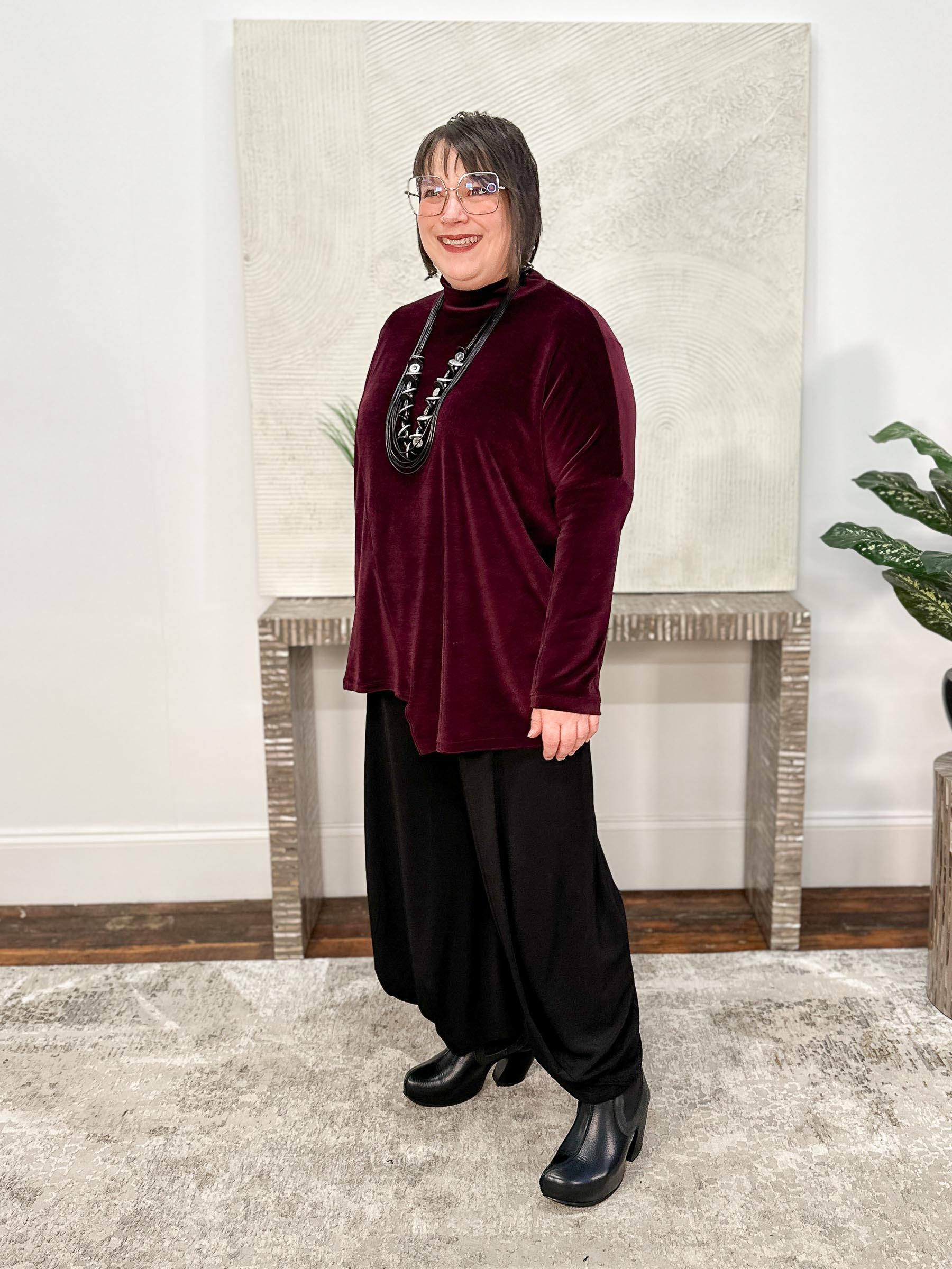 The Panorama Velvet Top is a casual velvet knit style that blends comfort with a touch of sophistication. Designed with a boxy silhouette, it features angular seam detailing at the front and back that leads to a striking angled asymmetric hemline. Finished with a mock neckline, long dropped sleeves, and a small Luukaa logo tag at the side hem, this versatile piece offers a polished yet effortless look that can be dressed up or down.