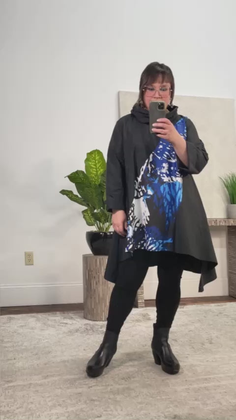 The Saga Tunic is a standout piece in lightweight memory woven fabric, blending artful detail with easy sophistication. The black body is accented by an asymmetric angled panel in the blue multicolor art print at the front, creating a striking yet balanced contrast.