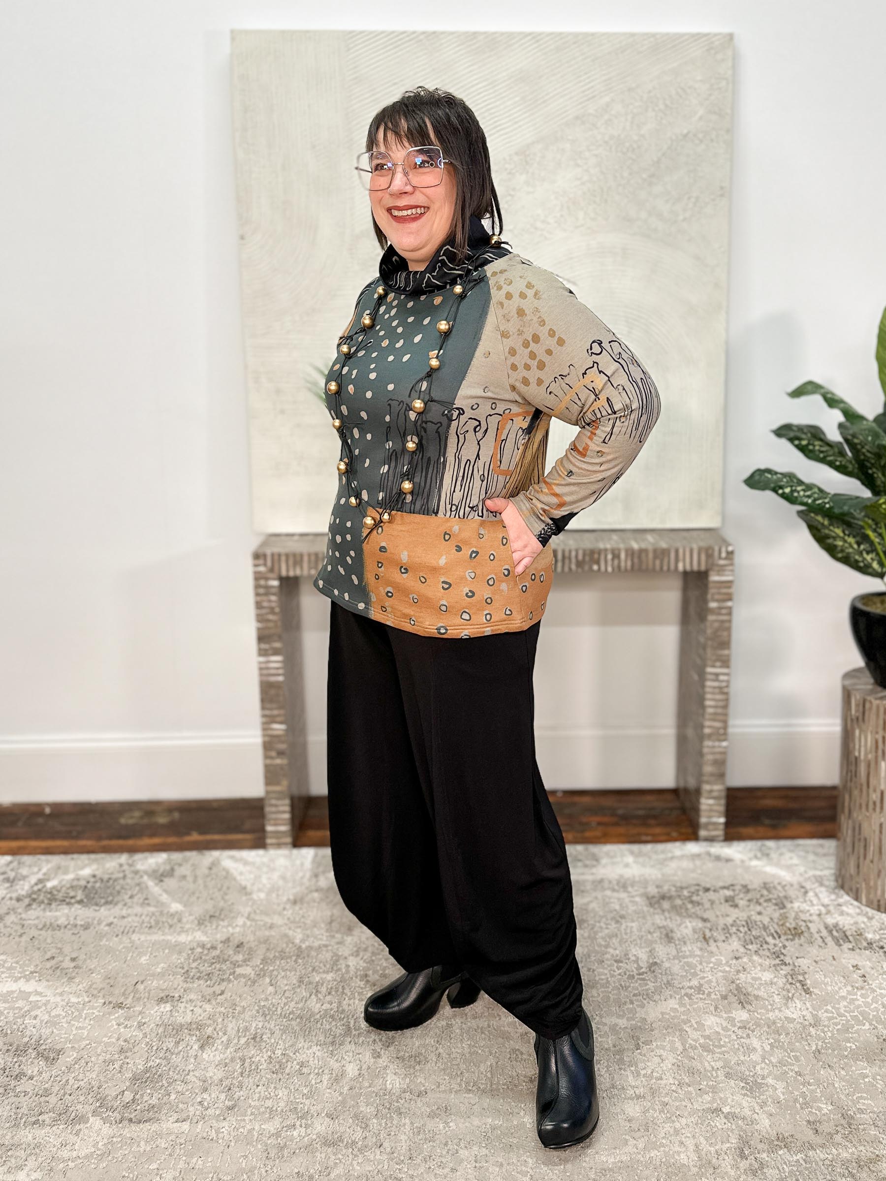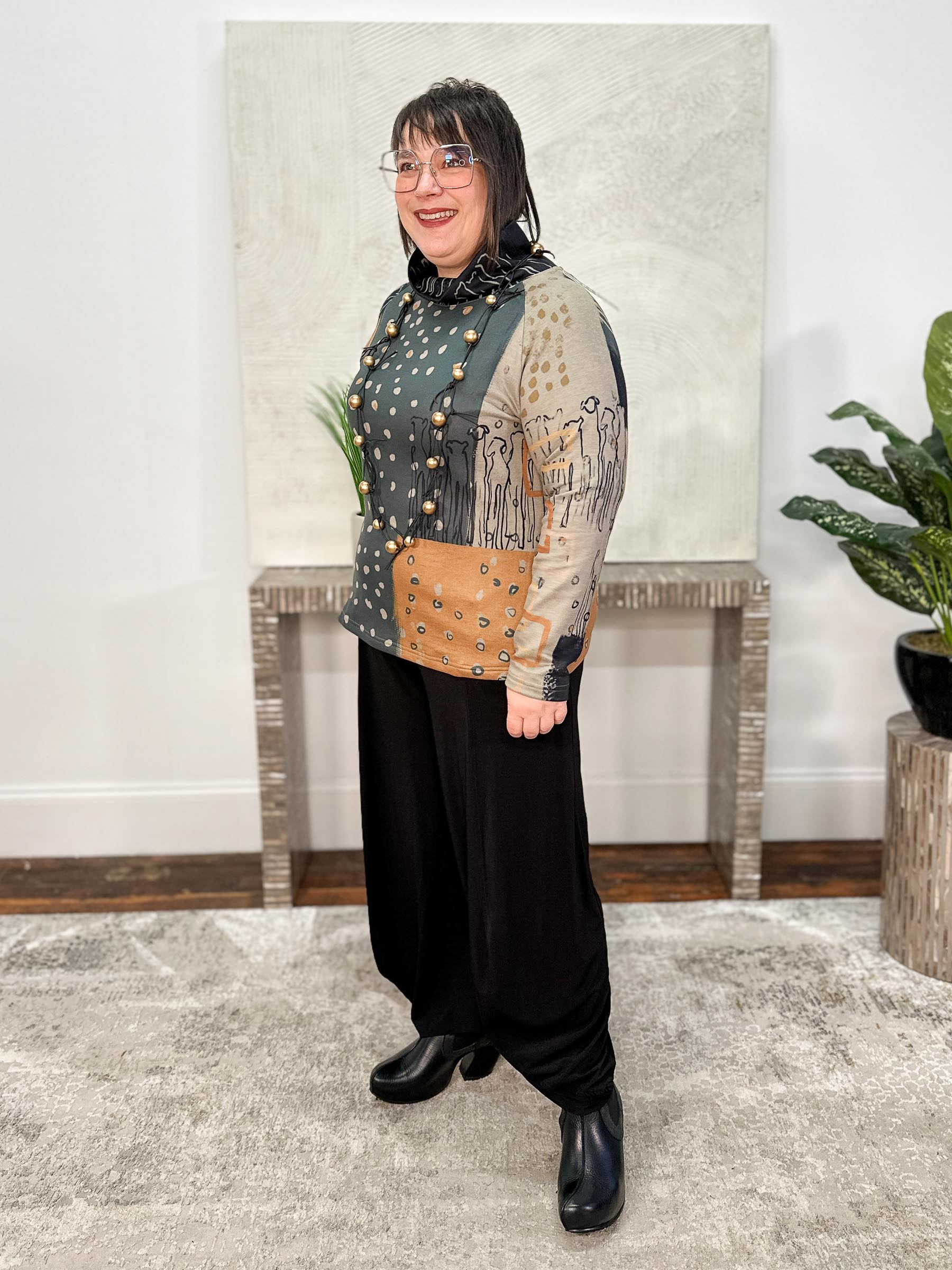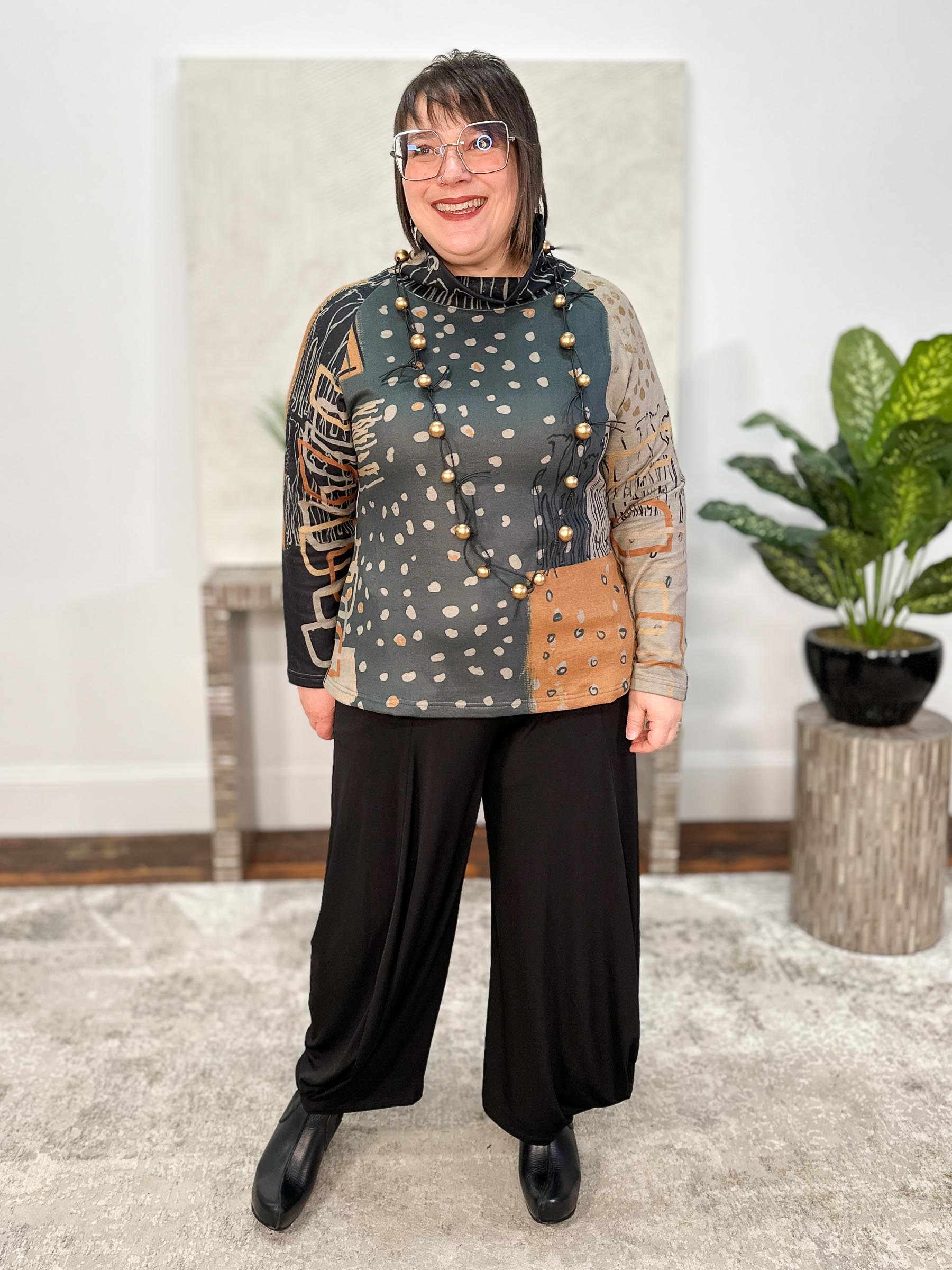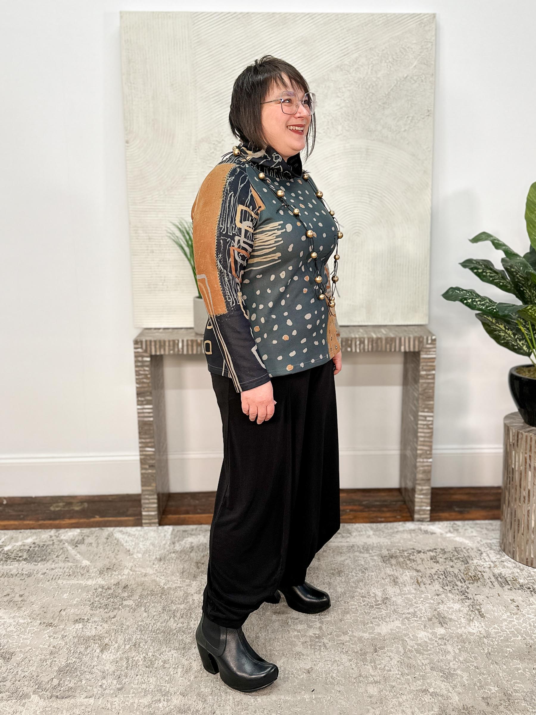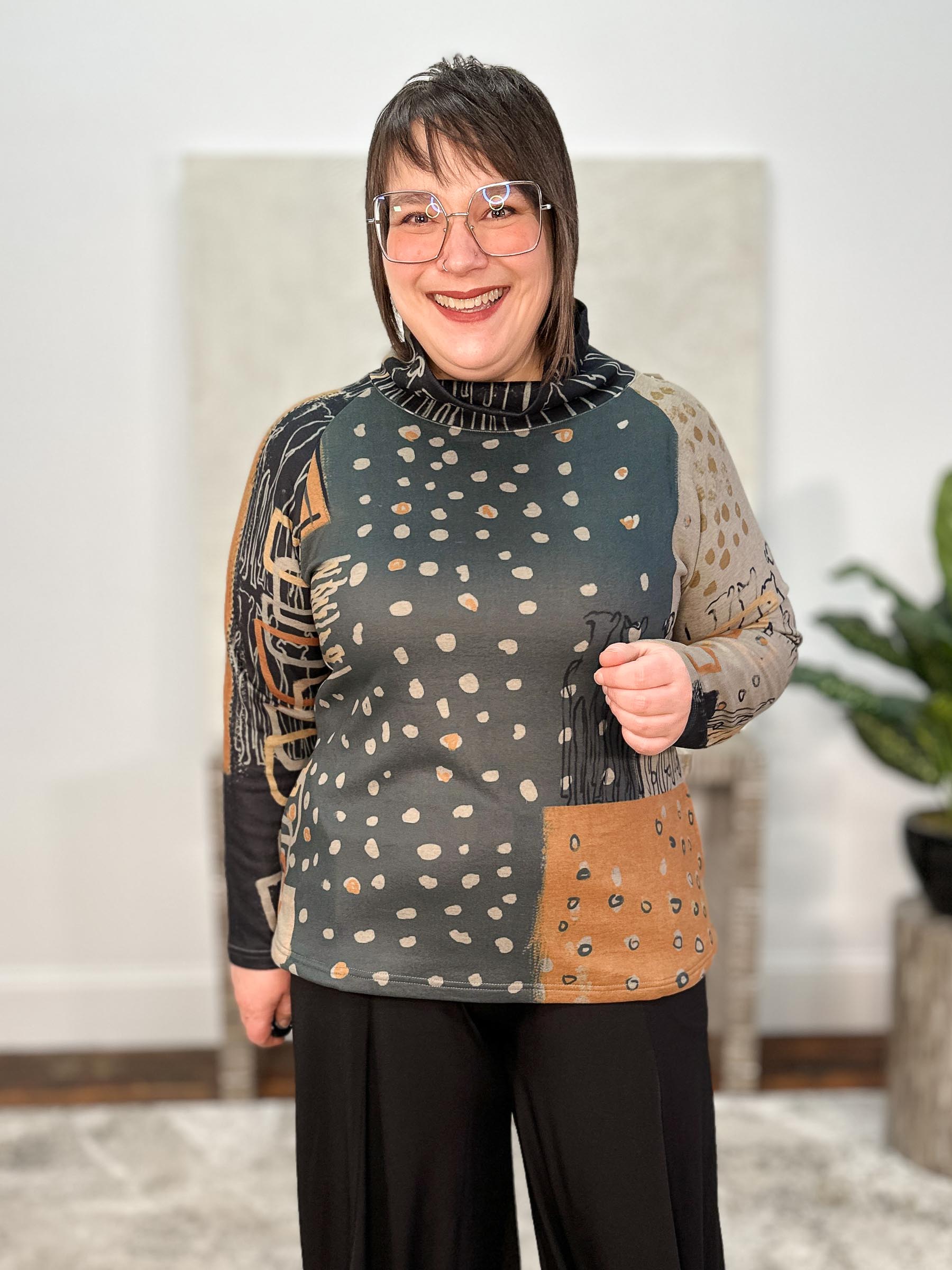 The Mock Neck Top in Dog Print is a modern, artful style crafted in a cozy brushed knit with an all-over abstract pattern that subtly reveals a dog motif. This slim A-line silhouette hugs the body for those who prefer a more fitted shape, offering a sleek yet comfortable look. Designed with raglan-set long sleeves, side-seam pockets, and a softly structured mock neckline, it’s an effortlessly chic piece that blends ease with a flattering finish.