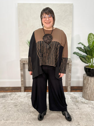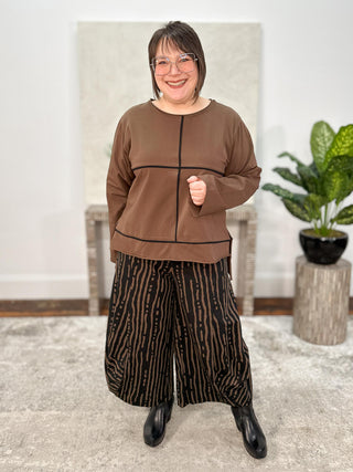 The Seamed Balloon Pant is an effortless blend of comfort and creativity, featuring a relaxed lantern shape with subtle seam detailing at the hem that forms a soft, ballooned silhouette through the leg. Crafted in an artful sgraffito print of dotted lines in black and brown, this style adds texture and visual interest to any look. Designed for ease with a clean, elasticized pull-on waistband and faux fly detail, these pants deliver a polished yet laid-back feel - perfect for pairing with your favorite Bread & Butter Italy tops.