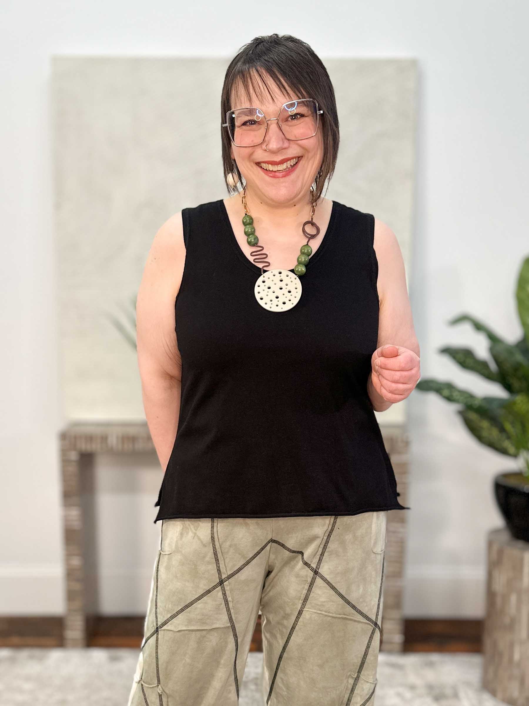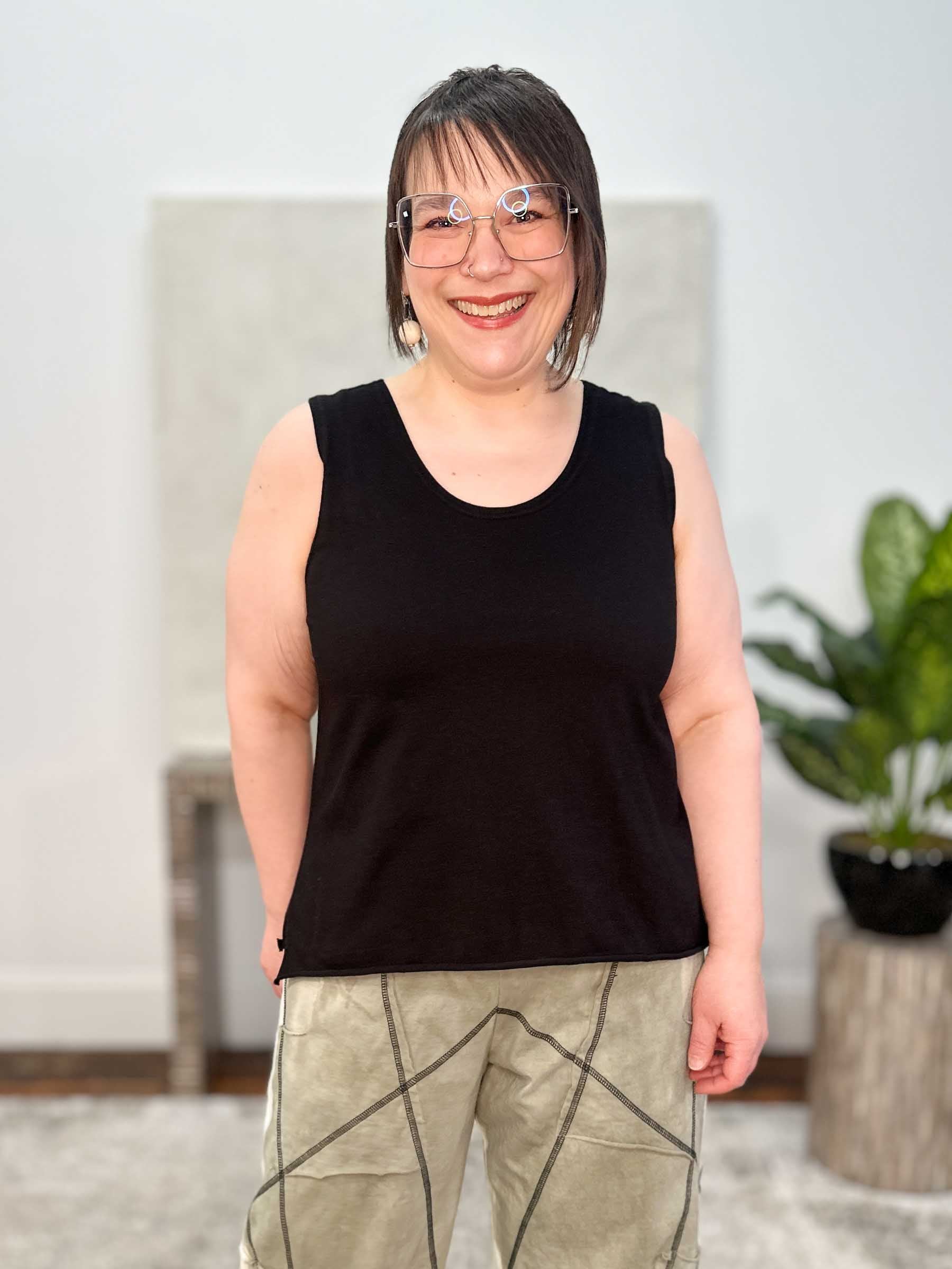 This Cynthia Ashby Knit Tank is an effortless everyday essential crafted in the brand’s signature cotton jersey knit, offering a soft, breathable feel with an easy relaxed drape. Designed with a shorter silhouette that hits at the high hip, this sleeveless style features a round U-neckline, unfinished hemline, and side vents that add a subtle edge and ease of movement. Perfect worn on its own or layered under your favorite jackets and toppers, it’s a versatile staple you’ll reach for again and again.