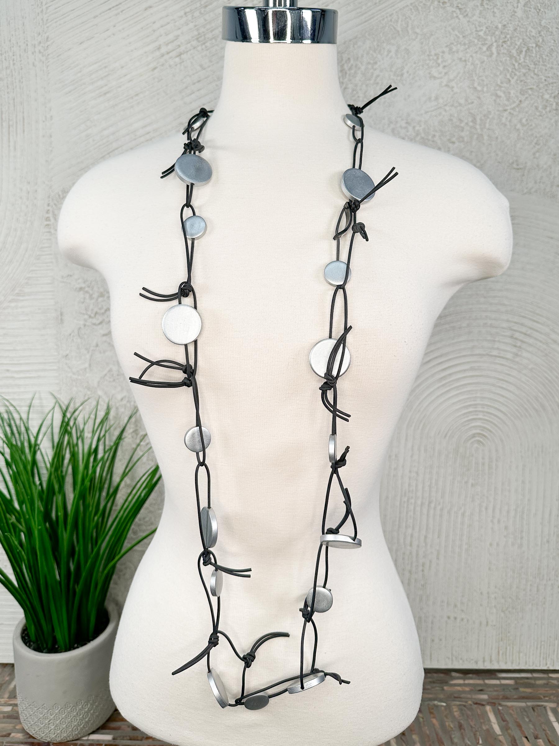 Jianhui's iconic jewelry is contemporary and artful. This style packs a big punch with two sizes of painted recycled wood disc coins knotted on leatherette links. Perfect on it's own or layered with other coordinating pieces. Wear long or doubled up!