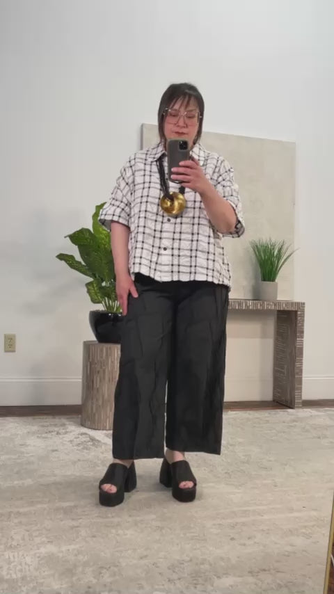 Polished with a modern, artful edge, the Princess Shirt in Finestra offers a timeless silhouette with effortless versatility. Designed in a classic boxy shape, this button-front style features a short length, cap sleeves, and a classic collar for a clean, structured finish. Crafted in a lightweight puckered black-and-white plaid, it brings subtle texture and visual interest while remaining easy to wear. Perfect for dressing up or down, this piece adds an elevated, gallery-chic feel to everything from tailored pants to relaxed, creative layers.