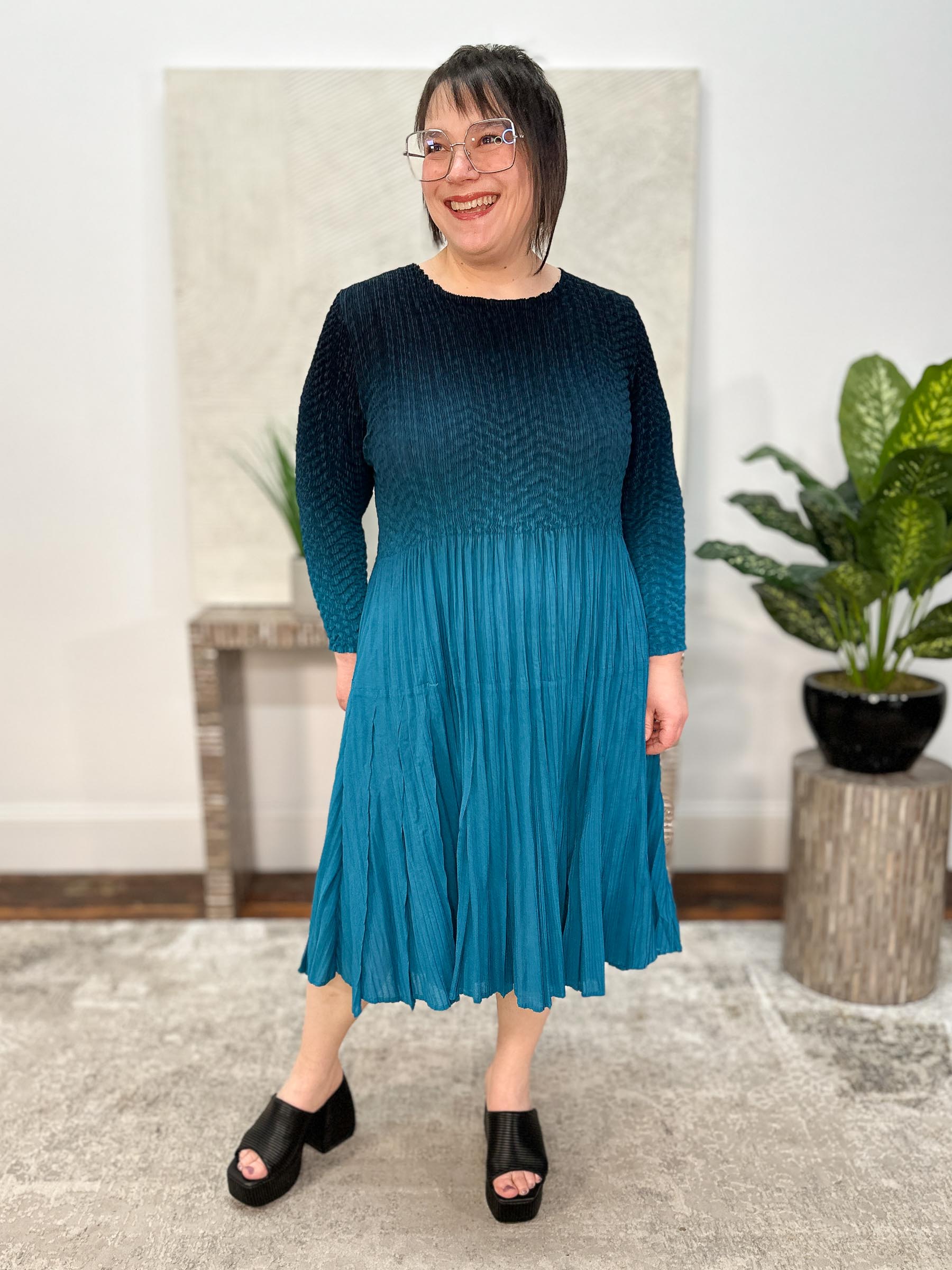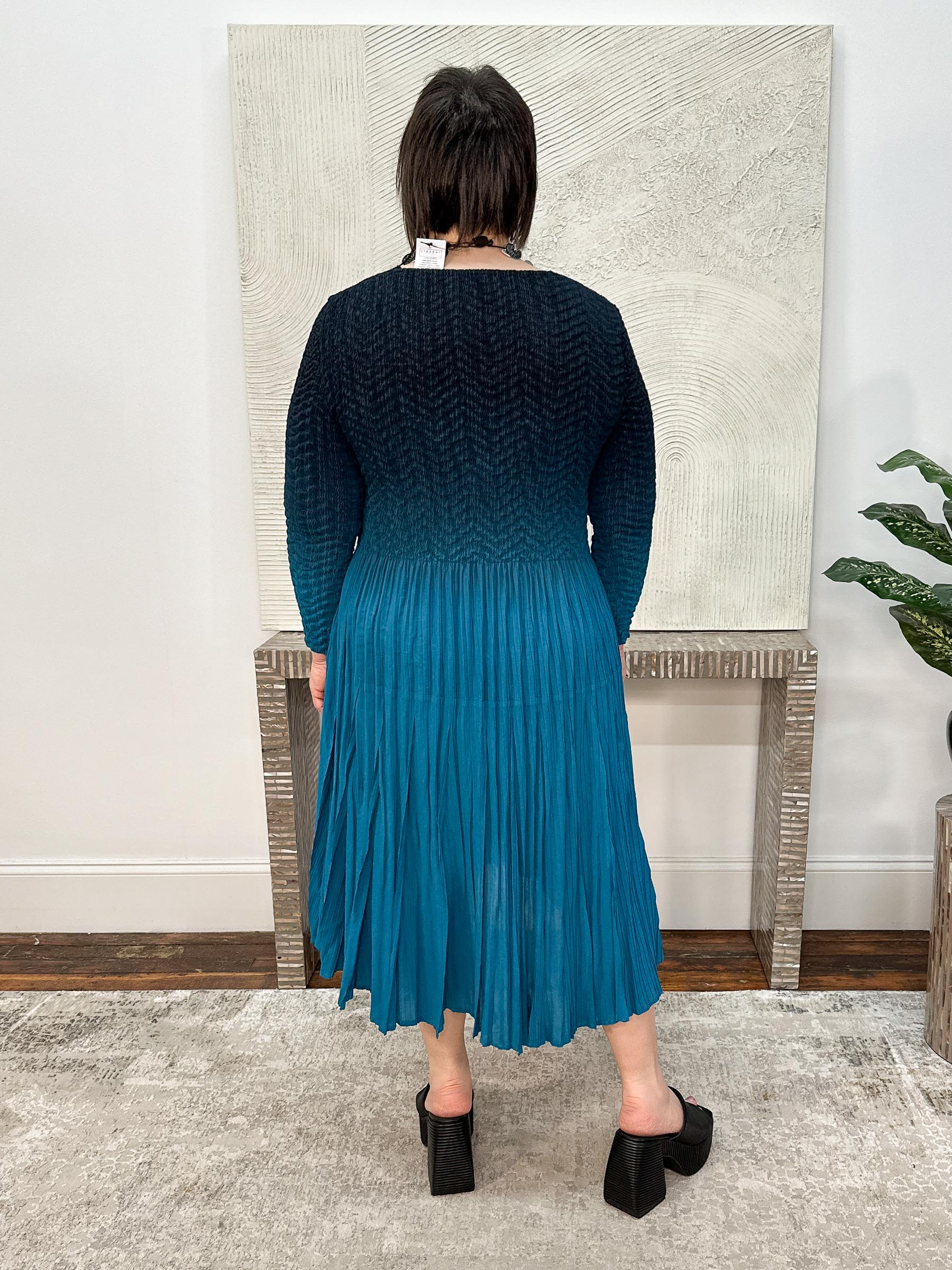 3/4 Sleeve Ombre Dress is a striking knee-length style crafted in Vanité Couture’s signature permanent pleats for sculptural shape and effortless wear. Chevron crush pleats at the bodice flow into organic vertical pleats through the skirt, creating beautiful texture and movement, while the ombré color effect transitions from deeper tones at the shoulders to brighter, more saturated hues from the waist down for an eye-catching finish. Designed with an easy, flattering one-size fit, this dress is finished with a soft high-low hemline, classic round neckline, and set-in three-quarter sleeves for a polished yet artful look that works for day or occasion.