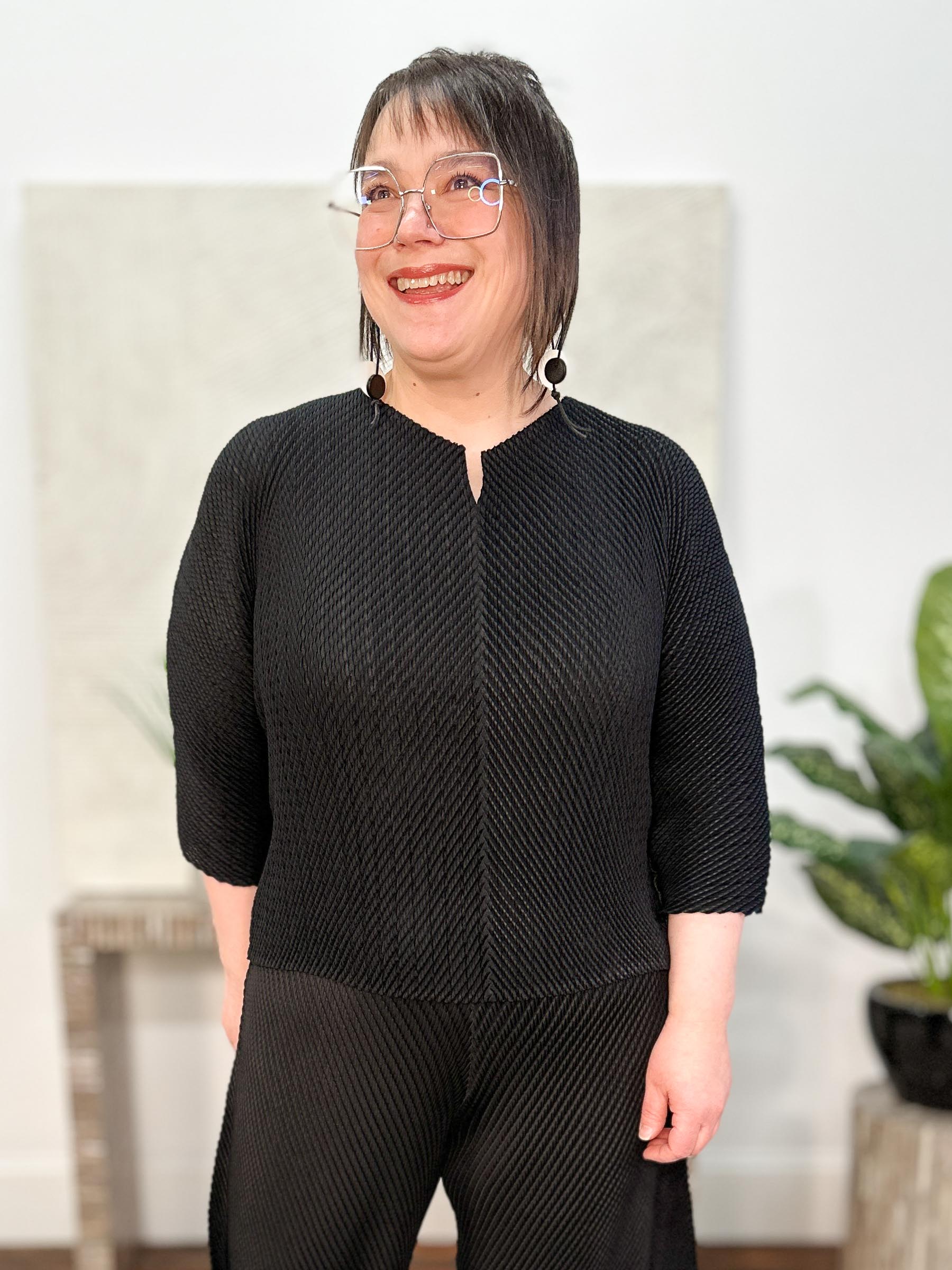 Split Neck Top brings a modern, easy shape to your wardrobe with its bouncy pleated fabric and relaxed, sculptural feel. Designed with a wedge silhouette that gently tapers toward the hem, this shorter style hits at the high hip for a clean, contemporary proportion. Finished with three-quarter dolman sleeves and a round neckline with a subtle center notch, it offers just the right balance of softness and structure. The one-size fit makes this top an effortless choice for pairing with statement pants or streamlined skirts, perfect for dressing up or keeping it casually polished.